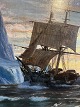 Beskrivelse: I E C Rasmussen parti fra Grønland med skib, isbjerge og solnedgang