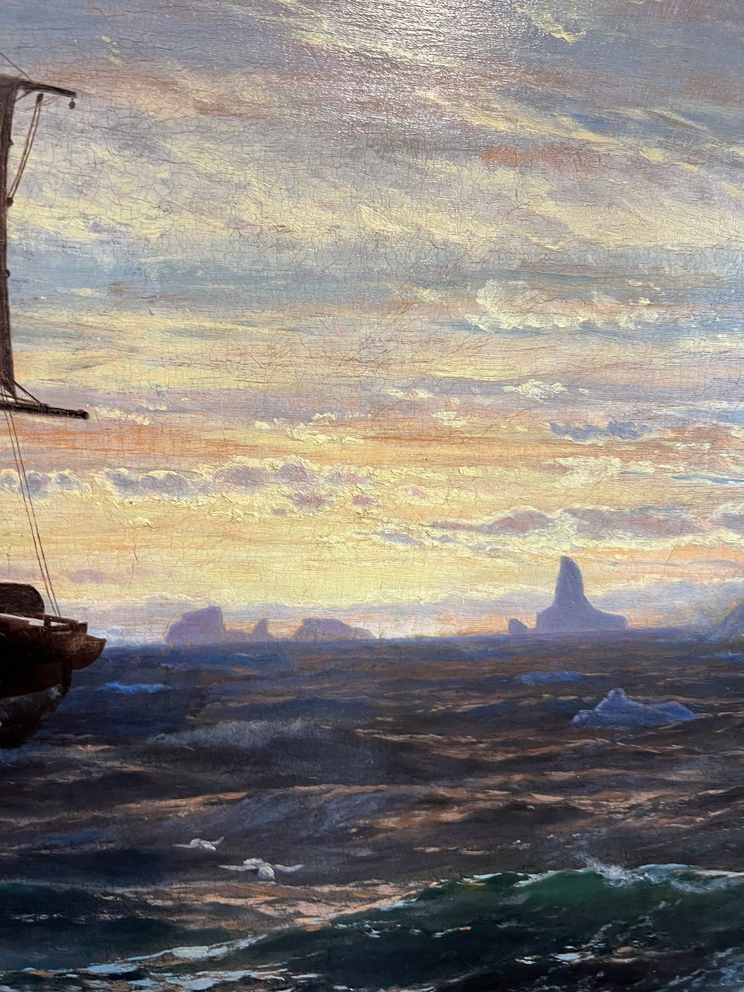 I E C Rasmussen parti fra Grønland med skib, isbjerge og solnedgang. Jens Erik Carl Rasmussen, 1841-93, olie på lærred. Signeret og dateret 1872. Lysmål: 98x156cm. Med ramme: 112x170cm