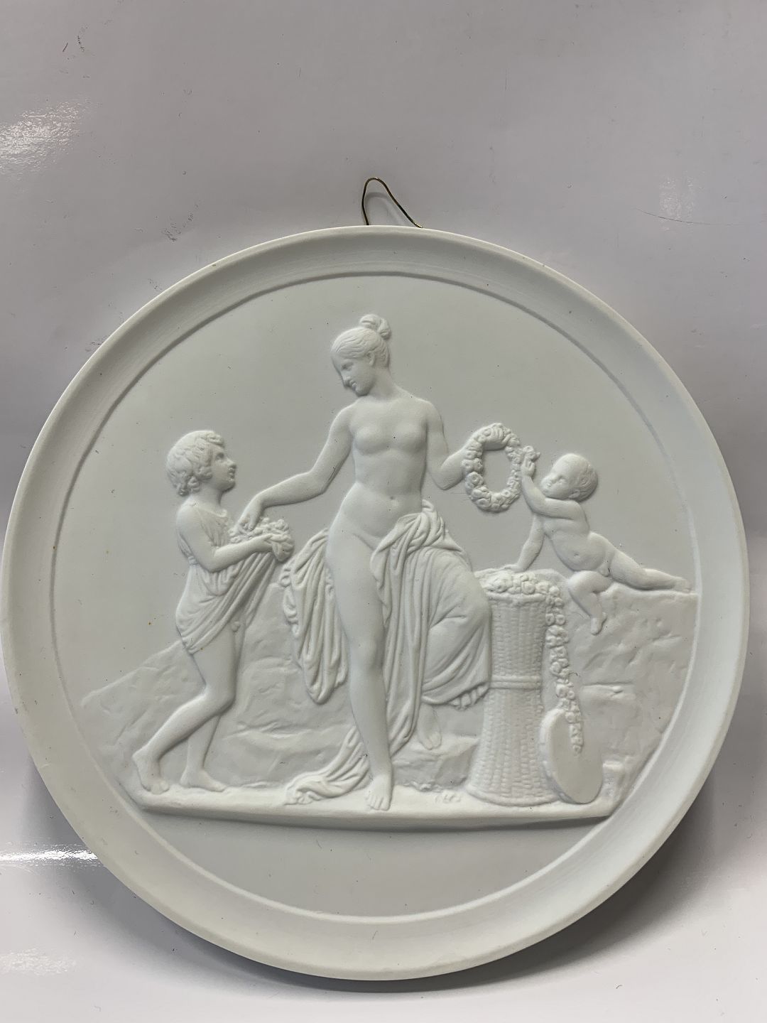 Beskrivelse: Royal Copenhagen Bisquit platte af Thorvaldsen "Barndom og Forår."