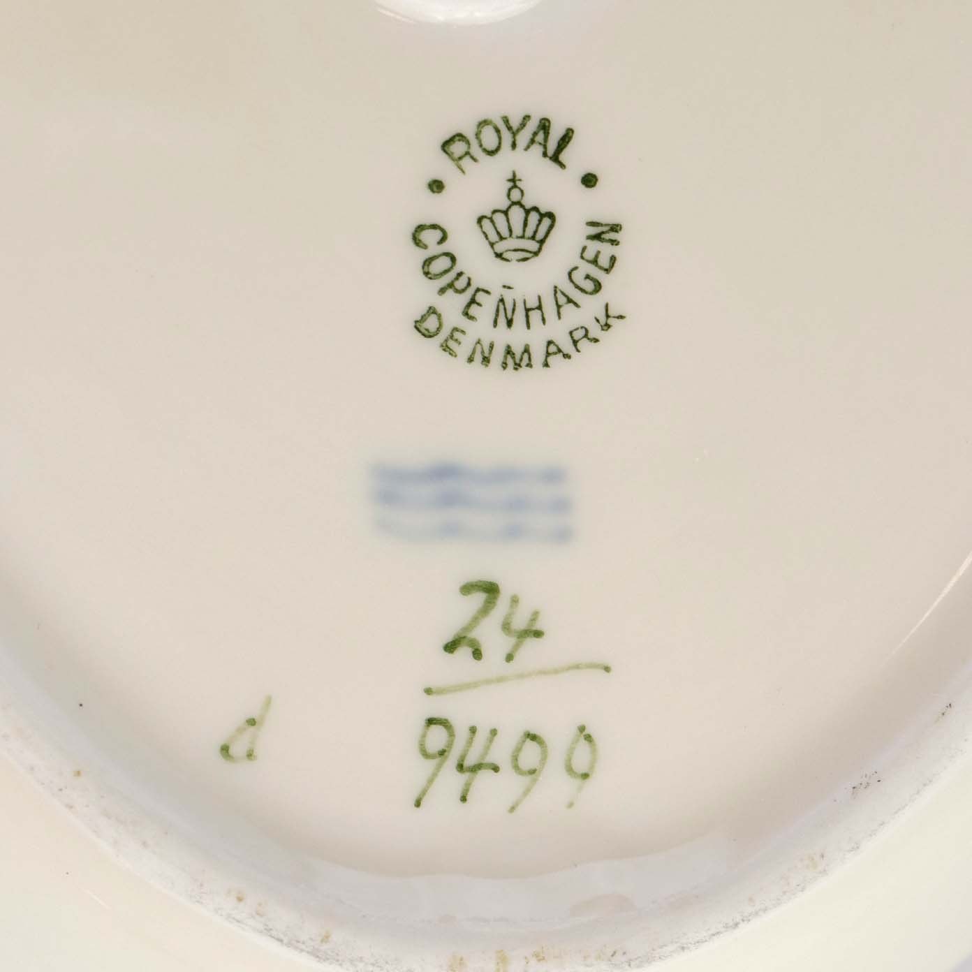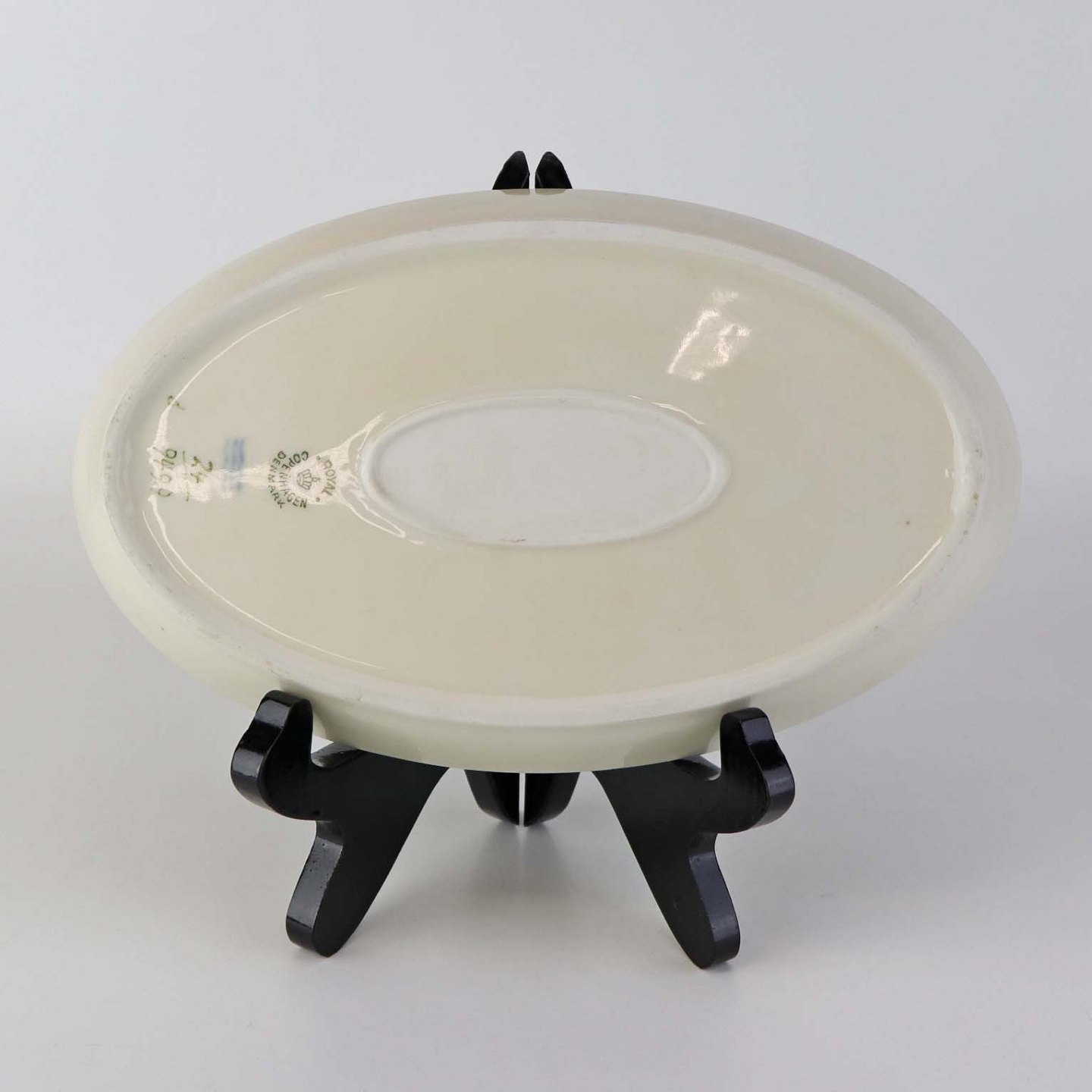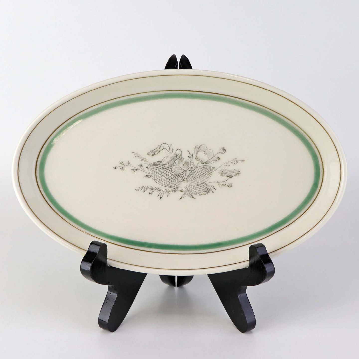 Beskrivelse: Lille kongelig ovalt fad i porcelæn fra stellet Asmil. Nr. 24/9499