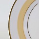 Service i glat hvid porcelæn med sandfarvet dekoration og gylden kant.