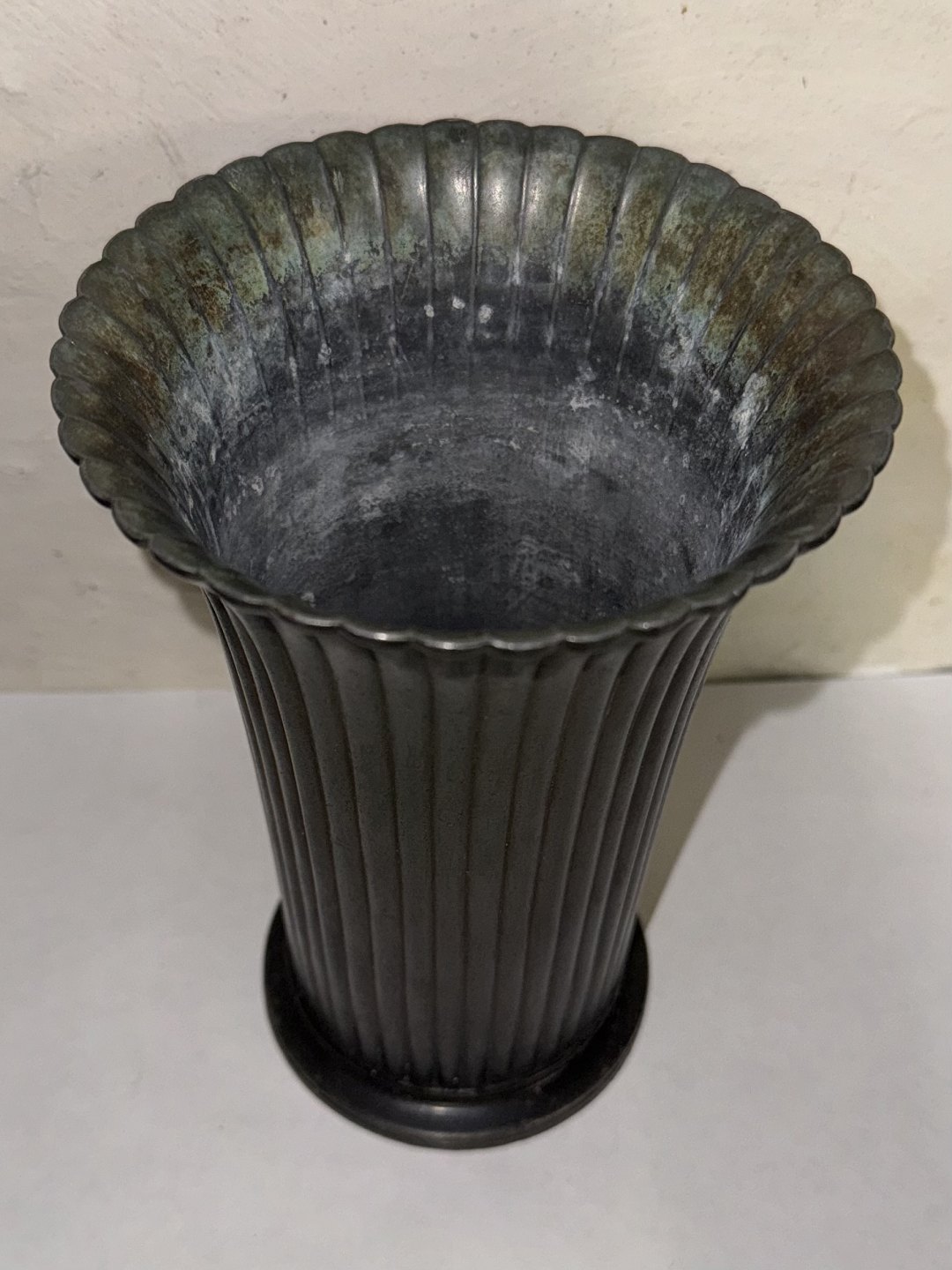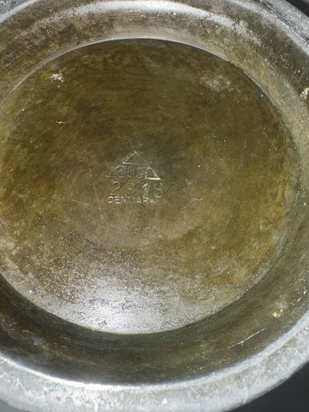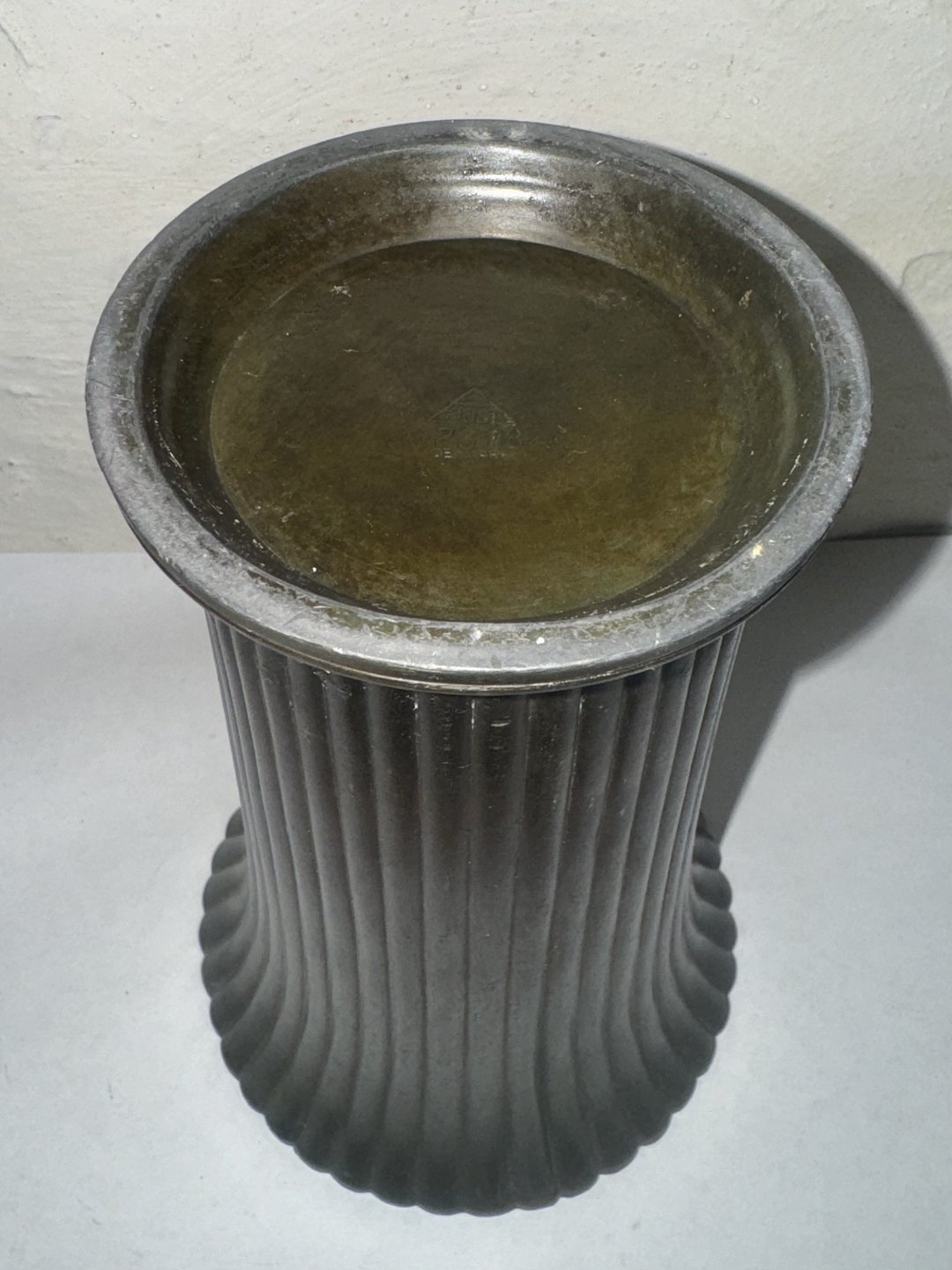 Description: ART DECO STYLE: Vase in disco metal from Just Andersen's workshop. Made in the 1940s. Has been used as a flower vase, which is why there are surface traces of use inside. Otherwise nothing to note. Factory mark on the bottom with logo and model number 2318 and DENMARK. Dimensions: H. 18 cm, the diameter of the top is 12.5 cm
