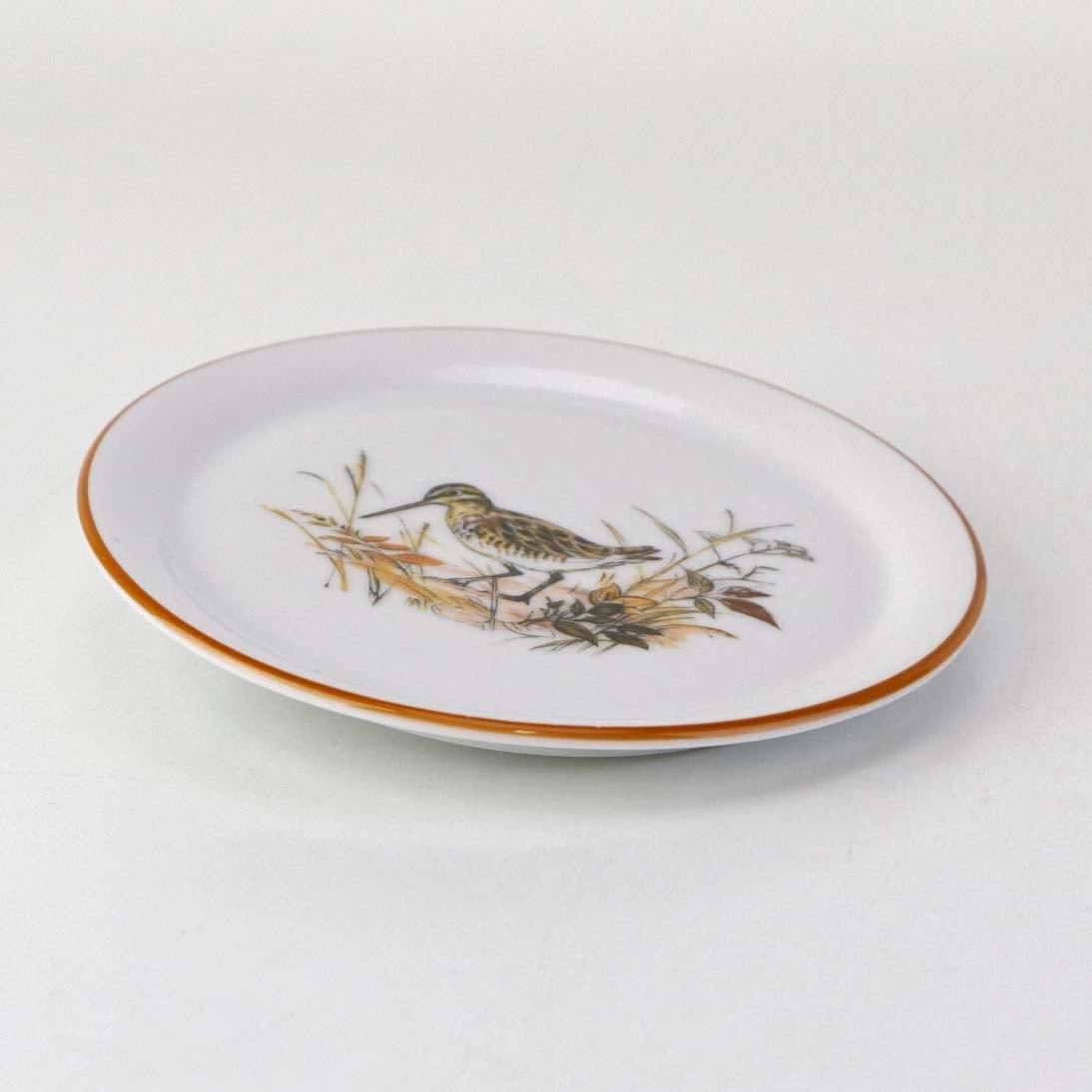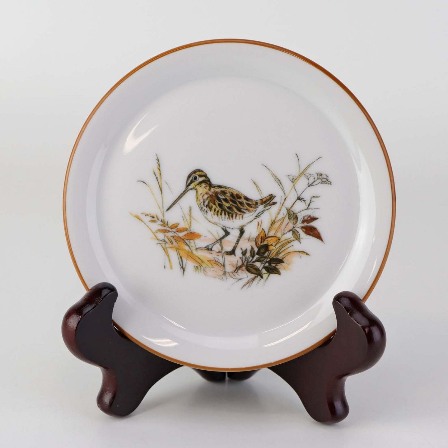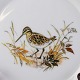 Beskrivelse: Rund asiet i porcelæn med motiv af en sneppe fra stellet Jagtstel.