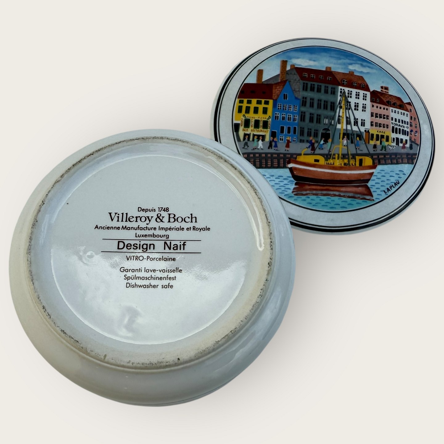 Description: Villeroy & Boch, Design Naif, Laplau motif from Nyhavn, small lidded jar, diameter 10cm, height 5cm *nice condition*