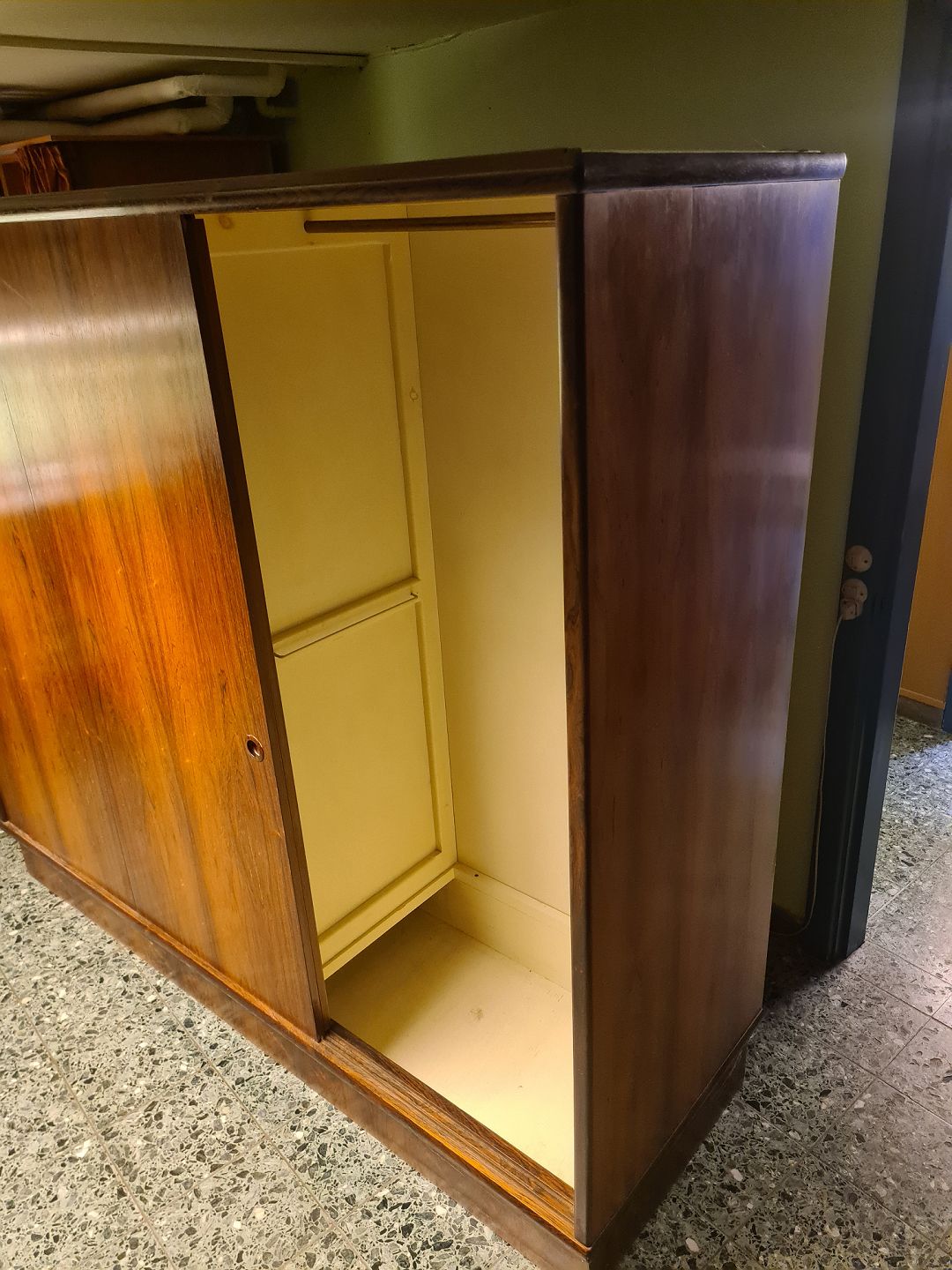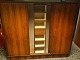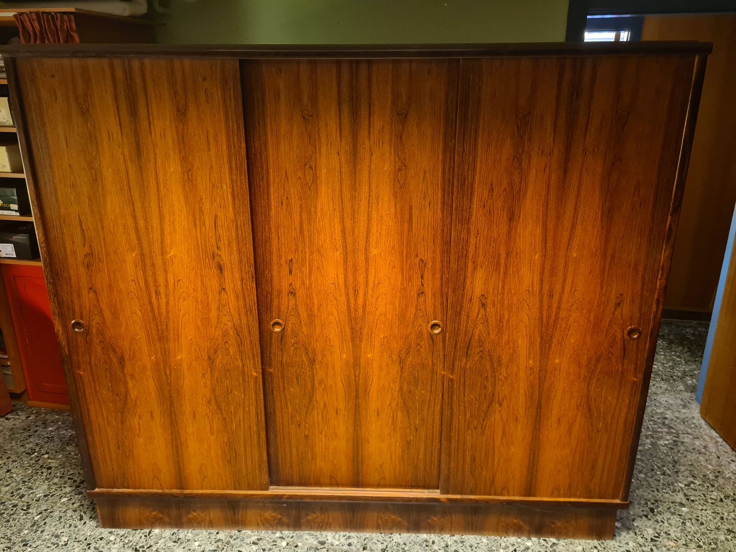 Beskrivelse: 3 dørs skydelåge klædeskab fra 1960'erne i finéret palisander. Fremstår uden overskab, og med uoriginal bund i venstre side (billede) plus et par skruehuller ligeledes i venstre side. (Billede)