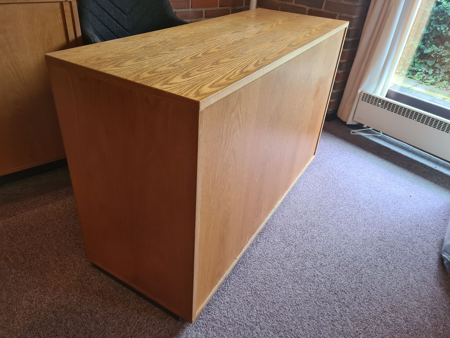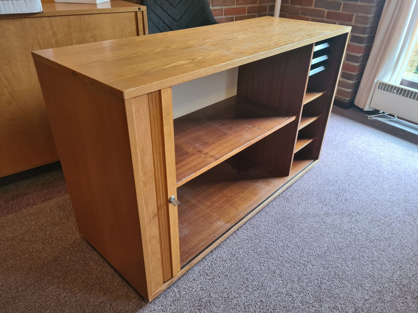Beskrivelse: Arkivskab fra 1980'erne i finéret eg med jalousi låge. Fremstår pænt og velholdt, dog med lettere brugsspor på toppen. (Billeder) Forskellige indretningsformer haves. Fungerende nøgle medfølger.