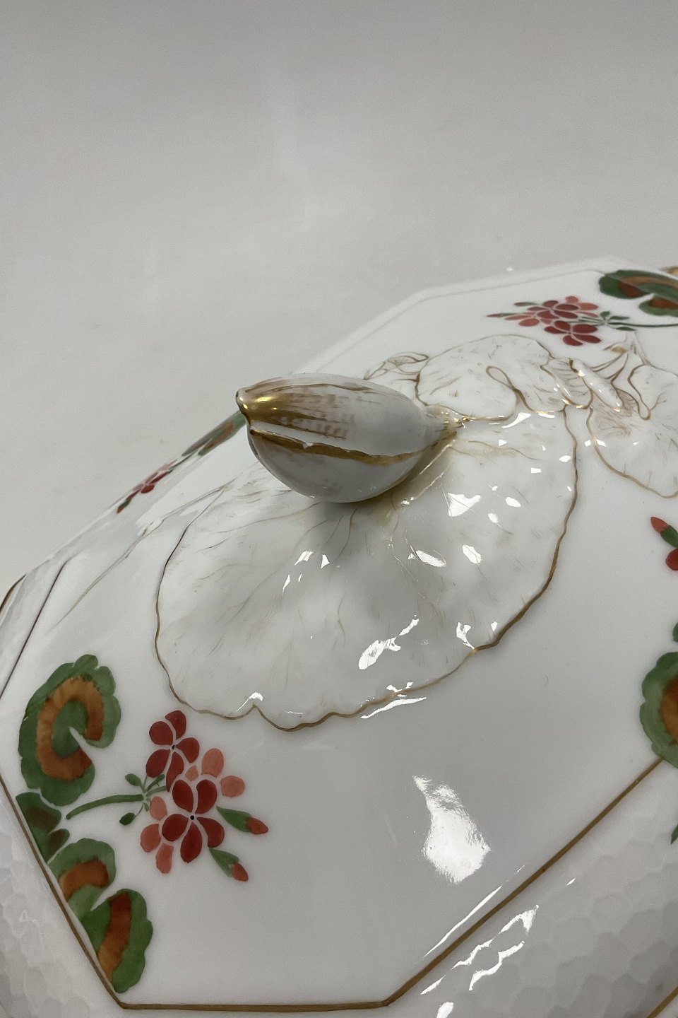 Beskrivelse: Royal Copenhagen Art Nouveau Stel No. 225 Pelargonie Terrin med fad No. 2038