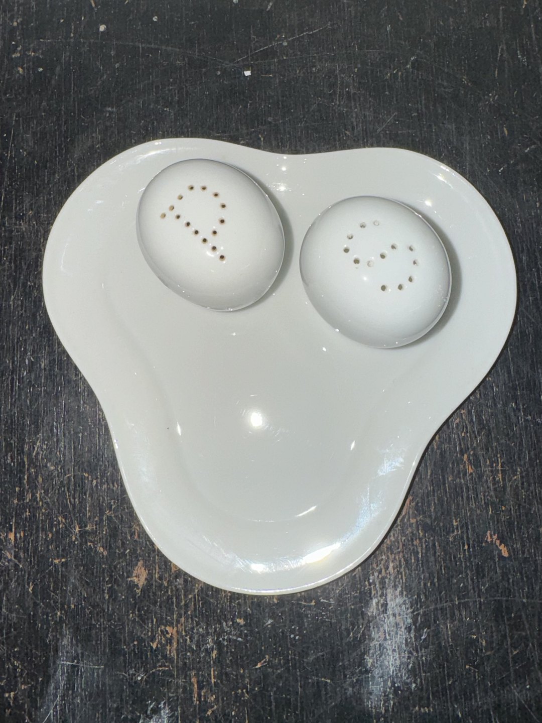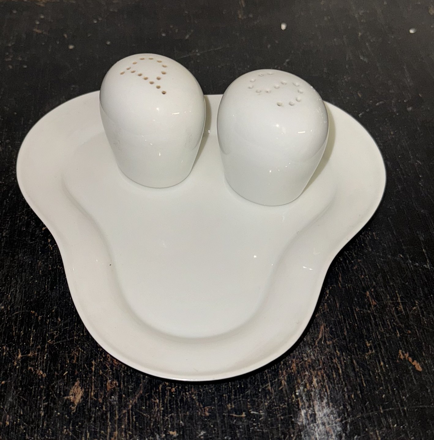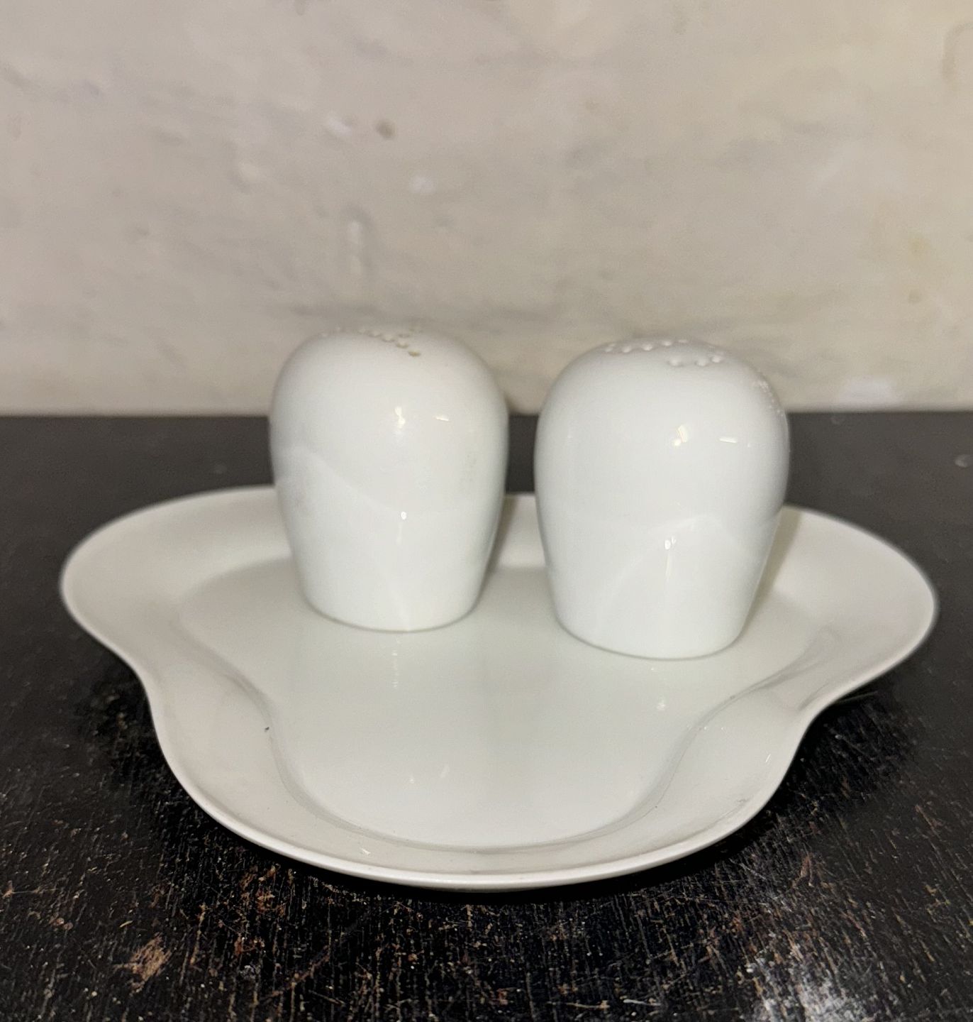 : Bing & Grøndahl salt -og pebersæt i hvidt porcelæn på bakke. I god stand