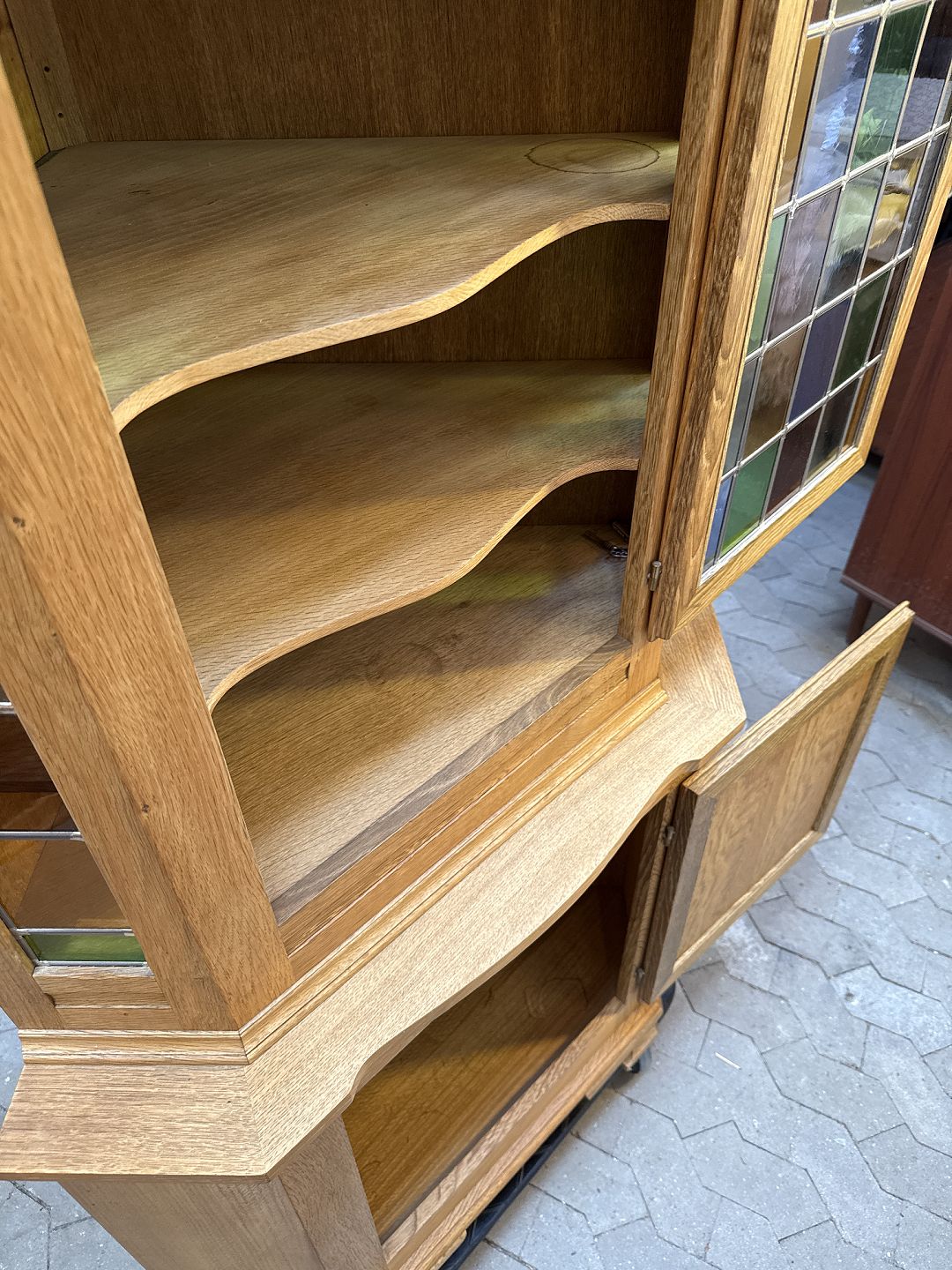 : Hjørneskab i delvis massiv egetræ, fra 1980’erne