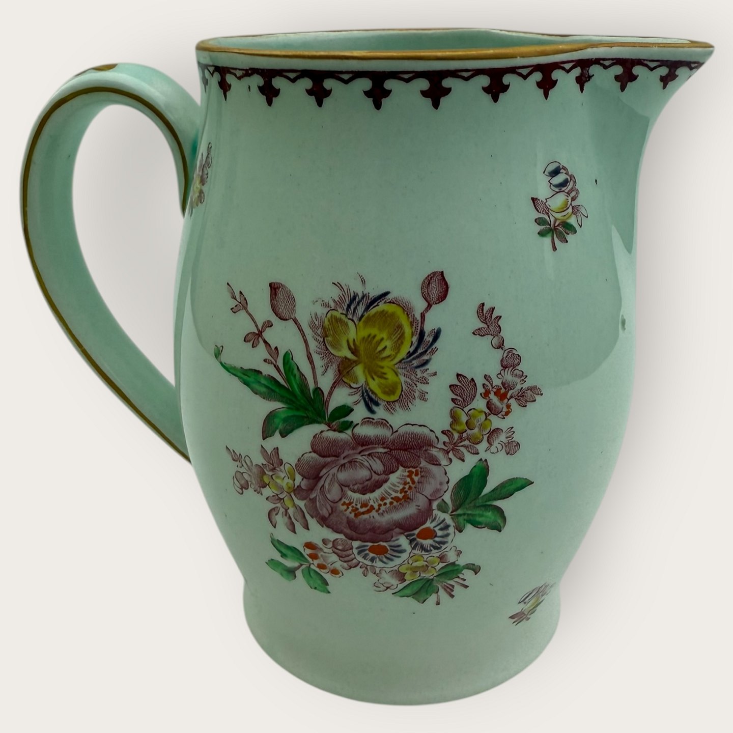 Description: Adams Calyx Ware, Chelsea Sprays red, Pitcher, 14.5cm high, width 17cm, *With small notch under the bottom (see photo) otherwise good condition *