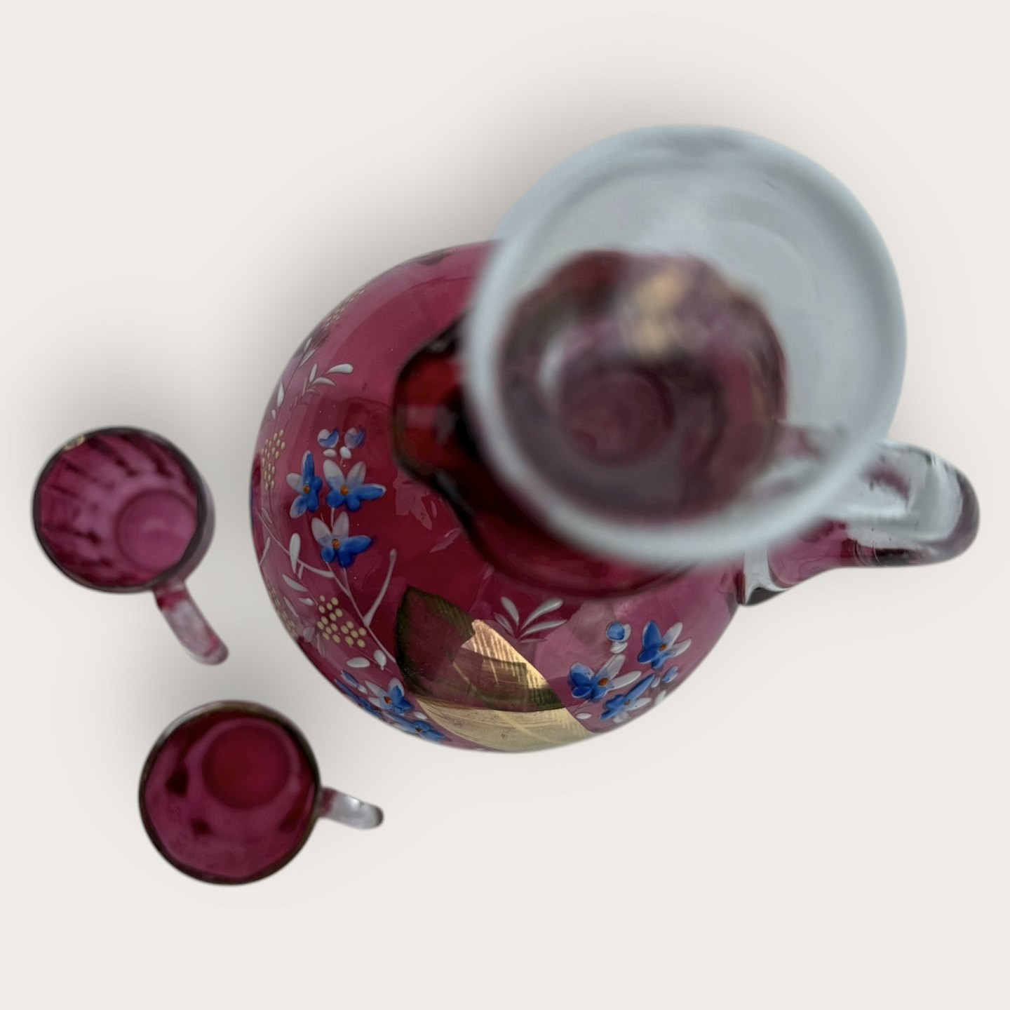 Beskrivelse: Ældre midteuropæisk karaffel i pinkfarvet glas med bemaling, medfølgende 2 glas, Karaffel ca. 21cm høj og 9cm bred, de to glas har meget små nøk i kanten, karaflen er i fin stand.