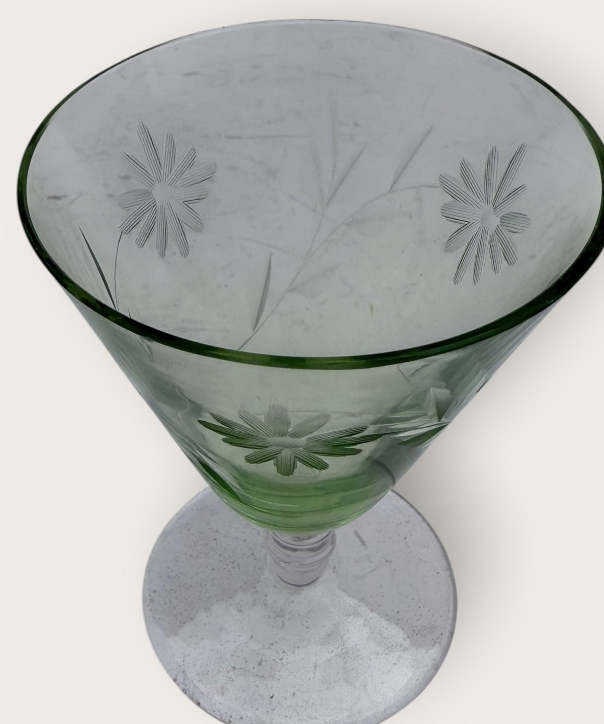 Description: Green white wine glasses with flower cuts, Height 10.5cm, diameter 7.5cm *nice condition*