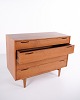 Beskrivelse: Kommode designet af Ib Kofod-Larsen og fremstillet af Brande Møbelfabrik i 1950’erne. Kommoden er udført i teaktræ med fire rummelige skuffer og karakteristiske, enkle greb, som understreger Kofod-Larsens rene og funktionelle formsprog.