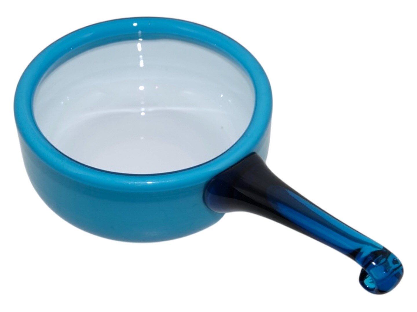 Description: Holmegaard Palet, small blue bowl with handle still with remains of the original Holmegaard label.