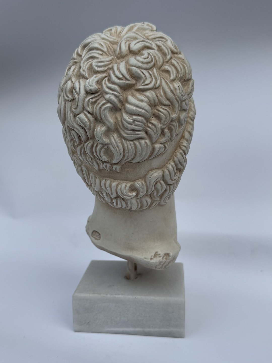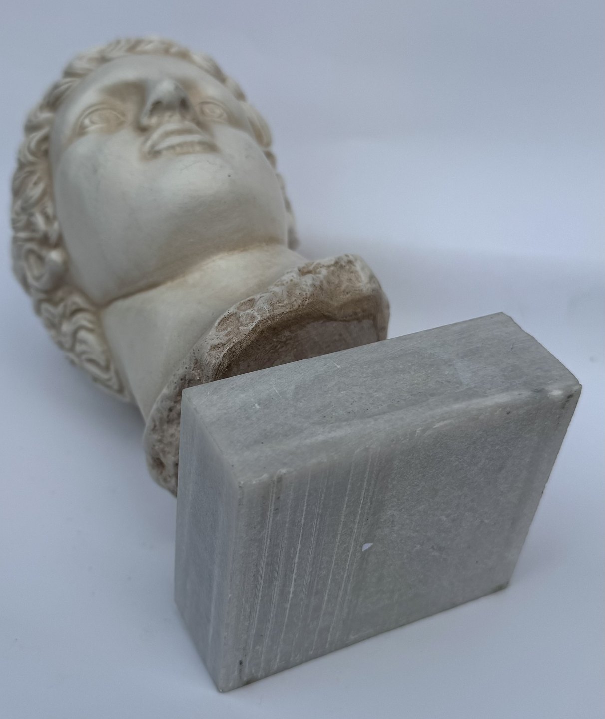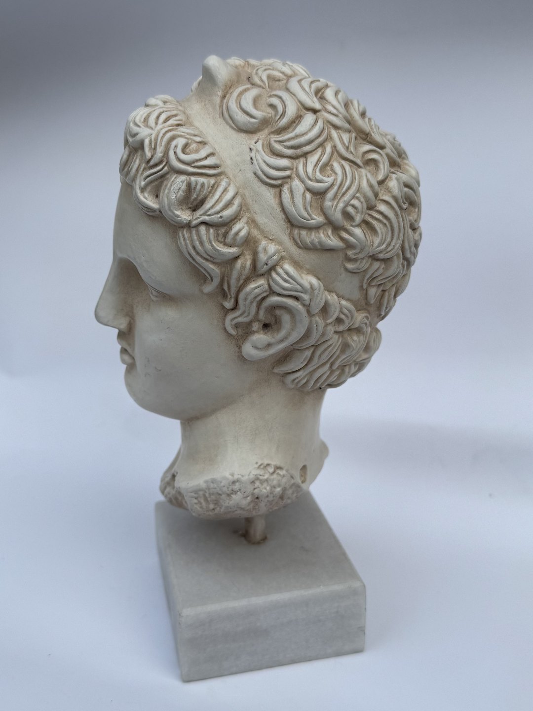 Beskrivelse: Buste, hoved skulptur, i gips af Efivos Marathon Boy. Stående på hvid base af stenart. Fremstår i god stand. H. 21,5 cm