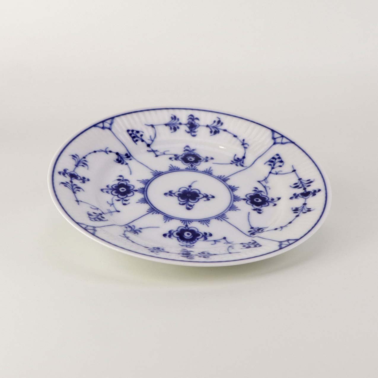 Beskrivelse: Flad kagetallerken i kongelig porcelæn fra stellet Musselmalet riflet. Nr. 1/300