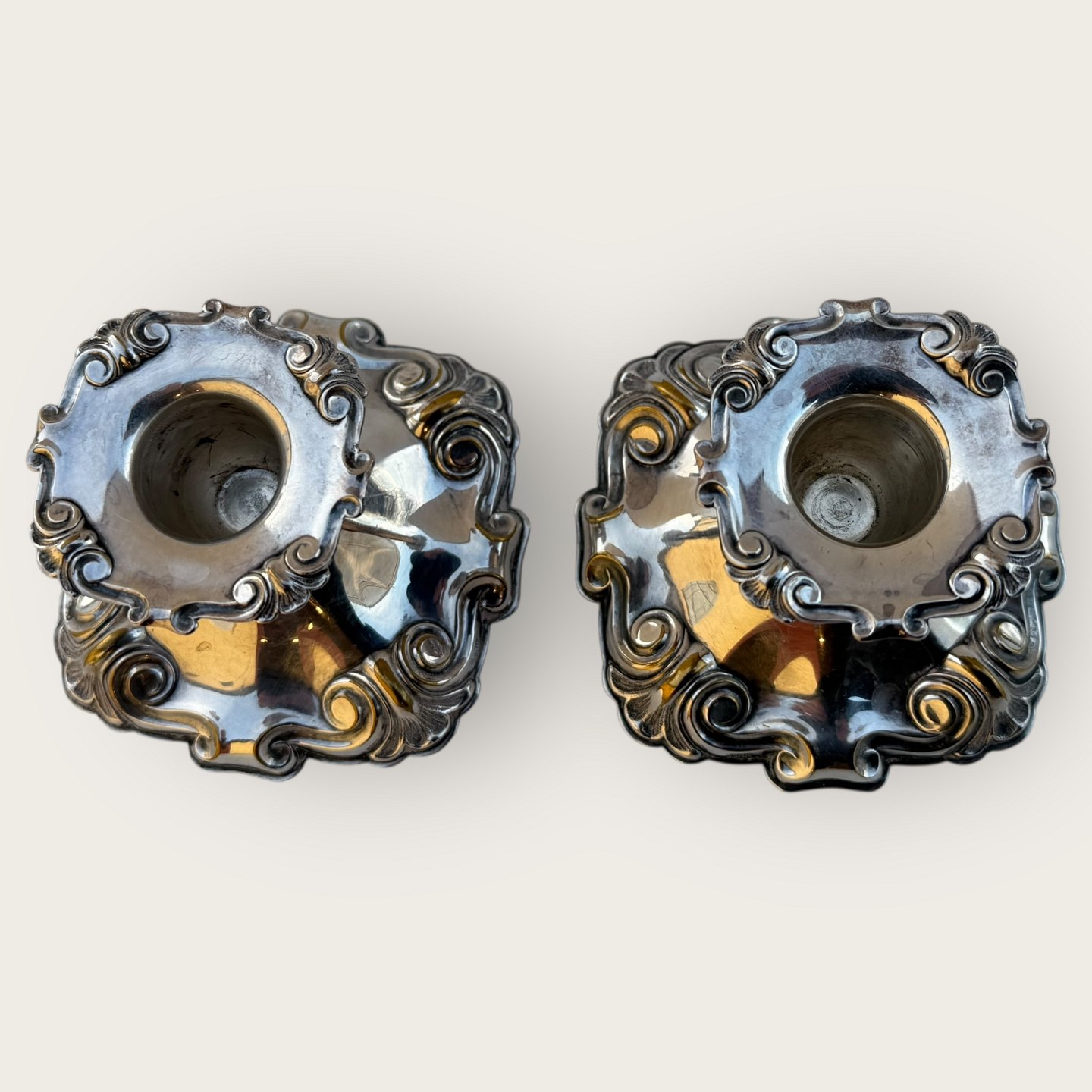 Beskrivelse: Cohr sølvvarefabrik, et par lysestager i sølvplet udfyldte i bunden, højde 6,5cm * Lidt slid på forsølvningen ellers pæn brugt stand*