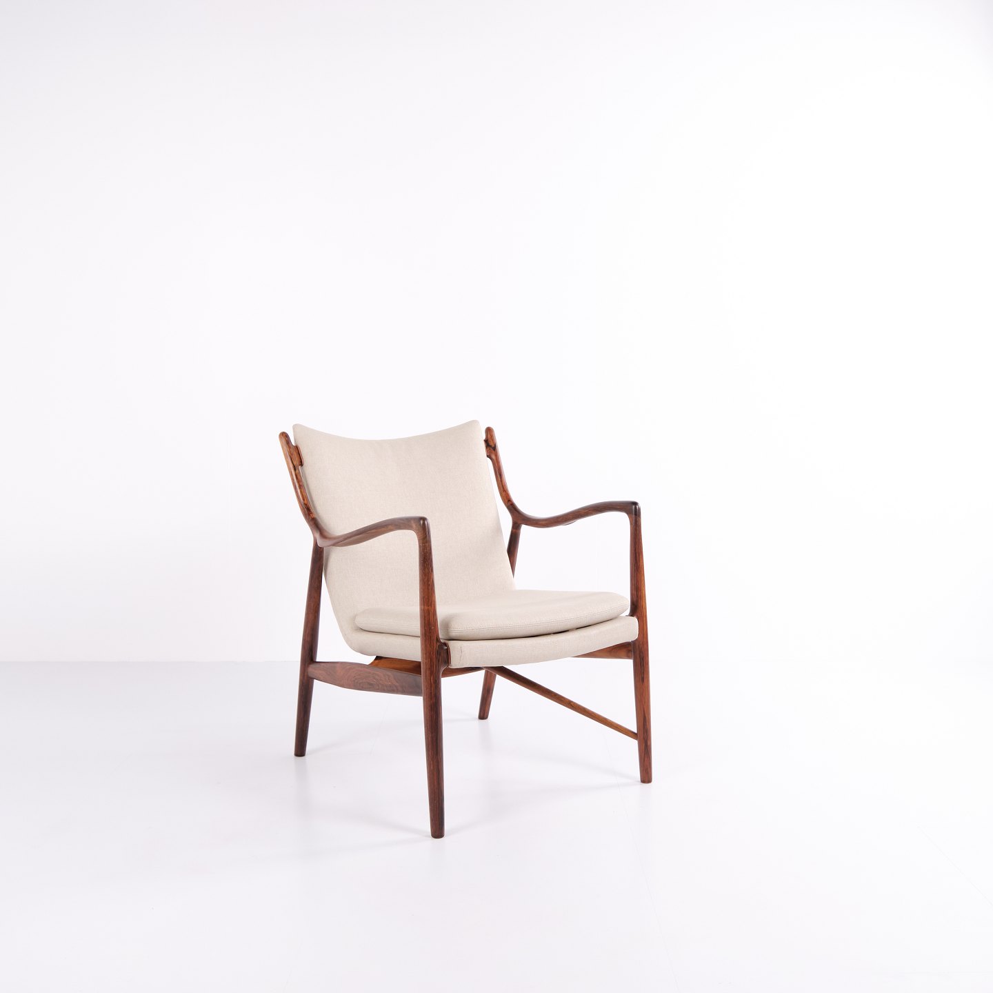 Description: Ikonischer Sessel, Modell NV45, entworfen von Finn Juhl und gefertigt vom Tischlermeister Niels Vodder in den 1950er-Jahren. Der Sessel besteht aus Palisanderholz und verfügt über eine freitragende Sitz- und Rückenlehne, die mit einem leichten Stoff bezogen ist. Dies unterstreicht Finn Juhls charakteristisches skulpturales Design und seine leichte Konstruktion.