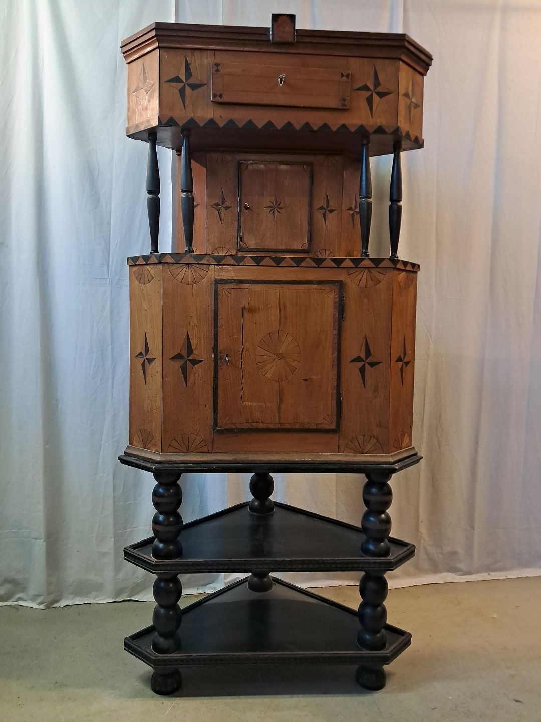 Beskrivelse: Hjørneskab i ege og elmetræ, det har 200 års jubilæum