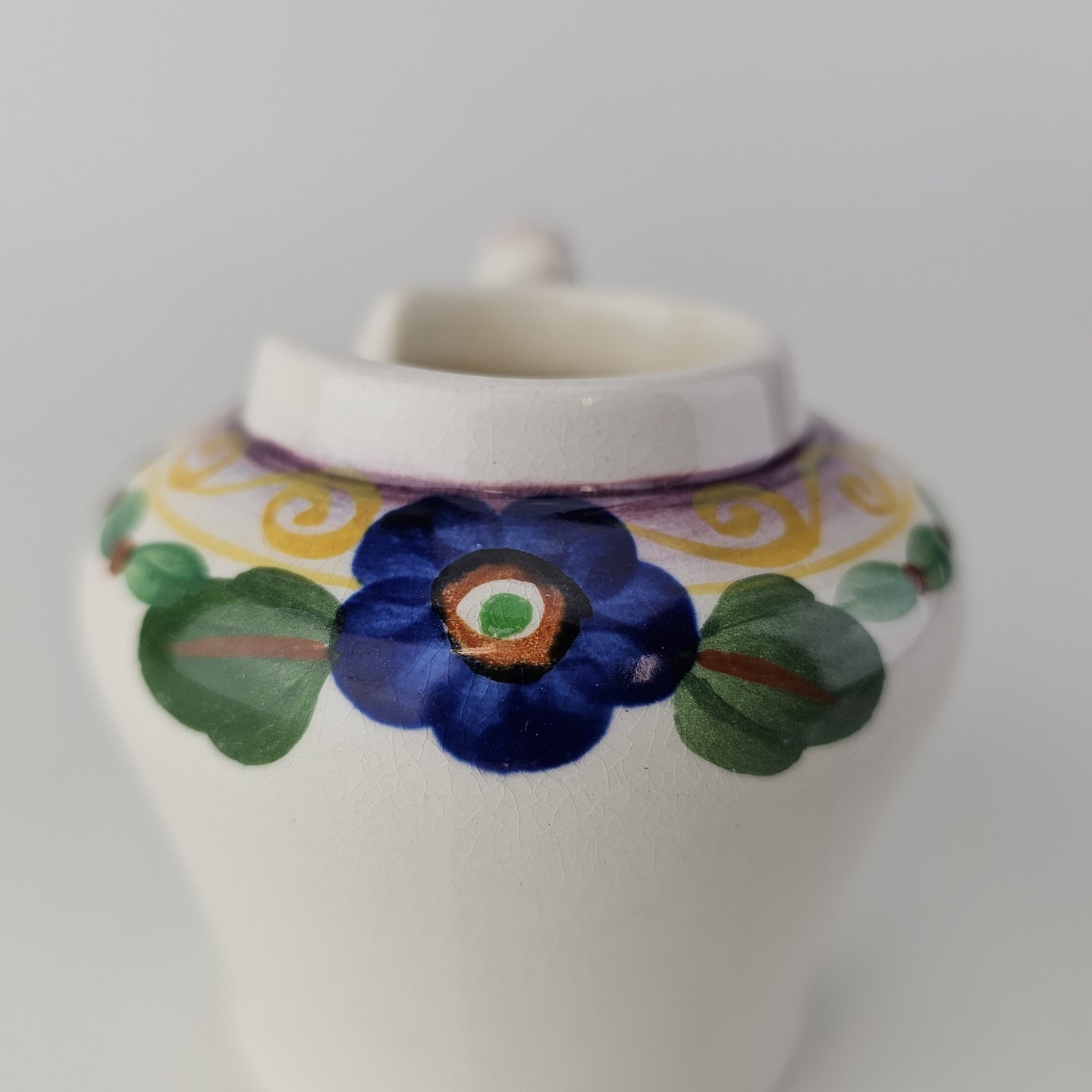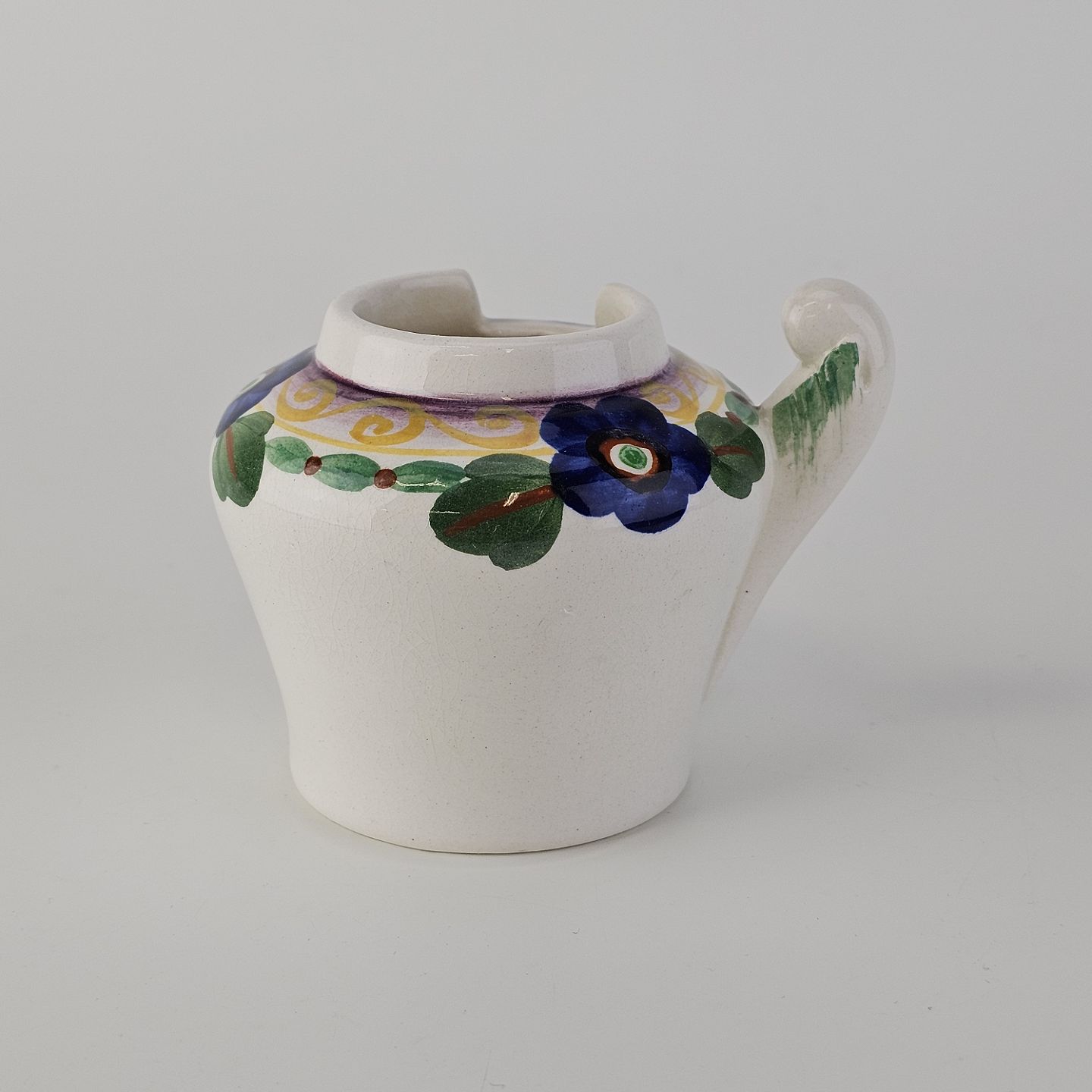 Beskrivelse: Sennepskrukke i fajance fra stellet Viol III