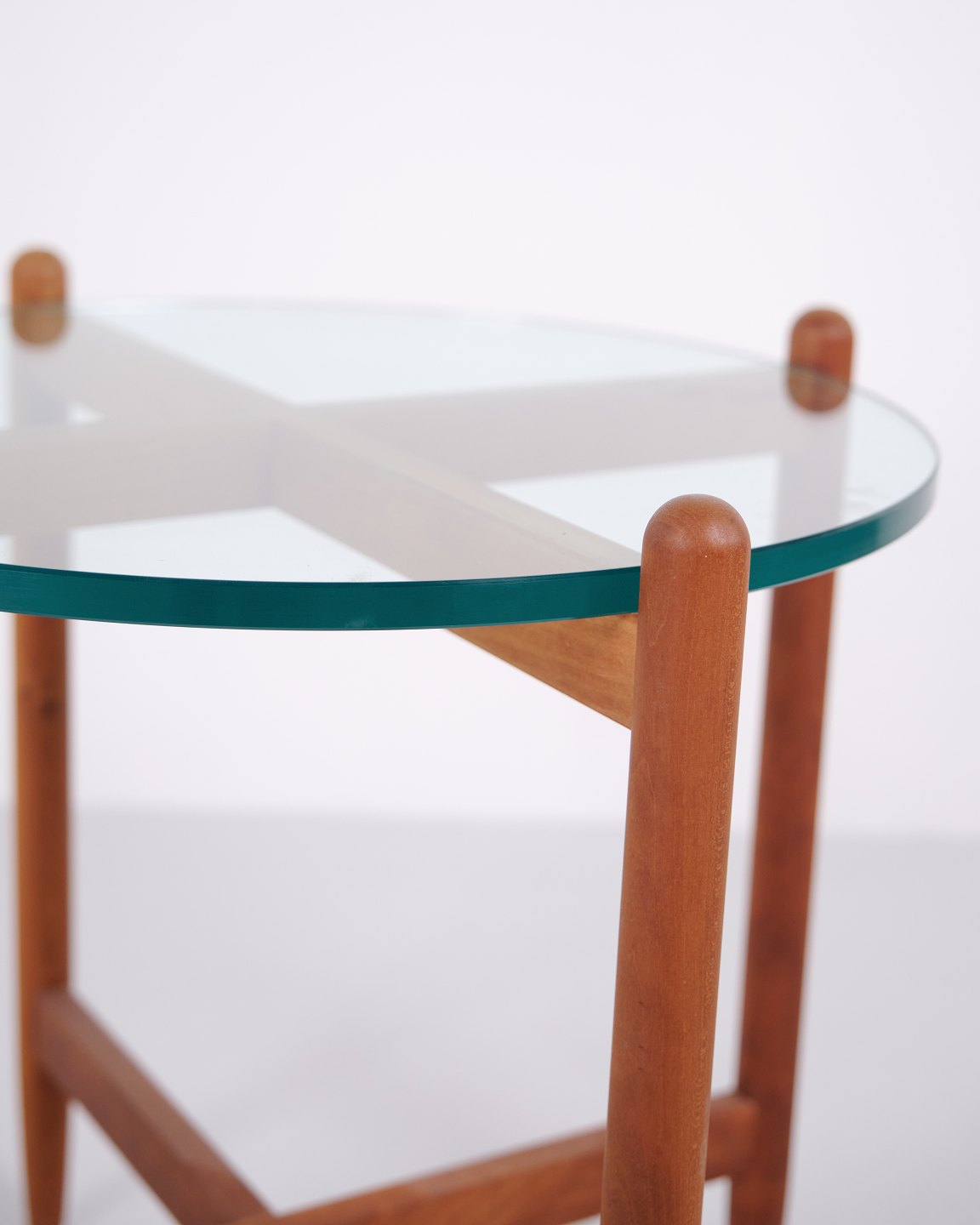 Beskrivelse: Svensk sidebord fra 1960’erne udført i kirsebær med rund glasplade. Bordet har organisk understel med blødt buede ben og gennemarbejdede samlinger, inspireret af formsproget fra Hans Johansson. Kombinationen af massivt træ og svævende glasplade er karakteristisk for skandinavisk design fra perioden. Velegnet som lampebord, sofabord eller mindre sidebord.