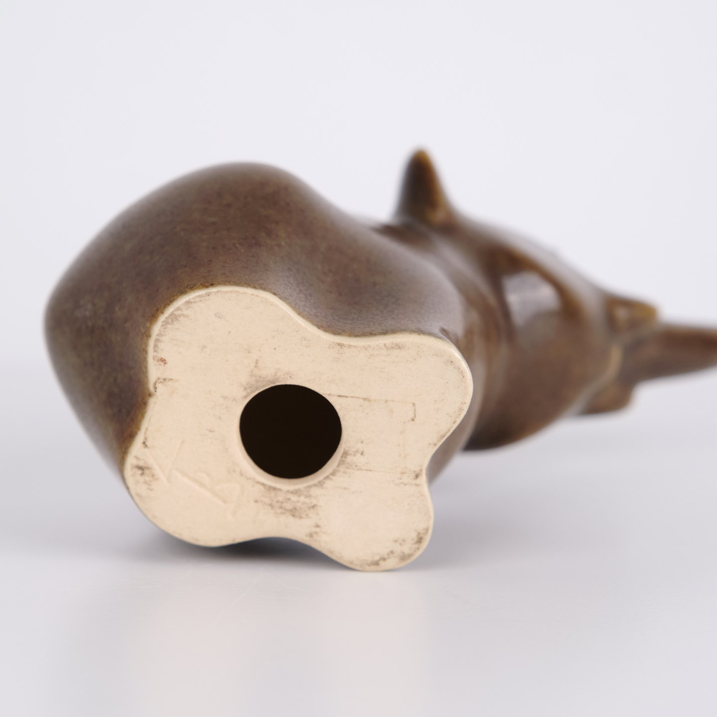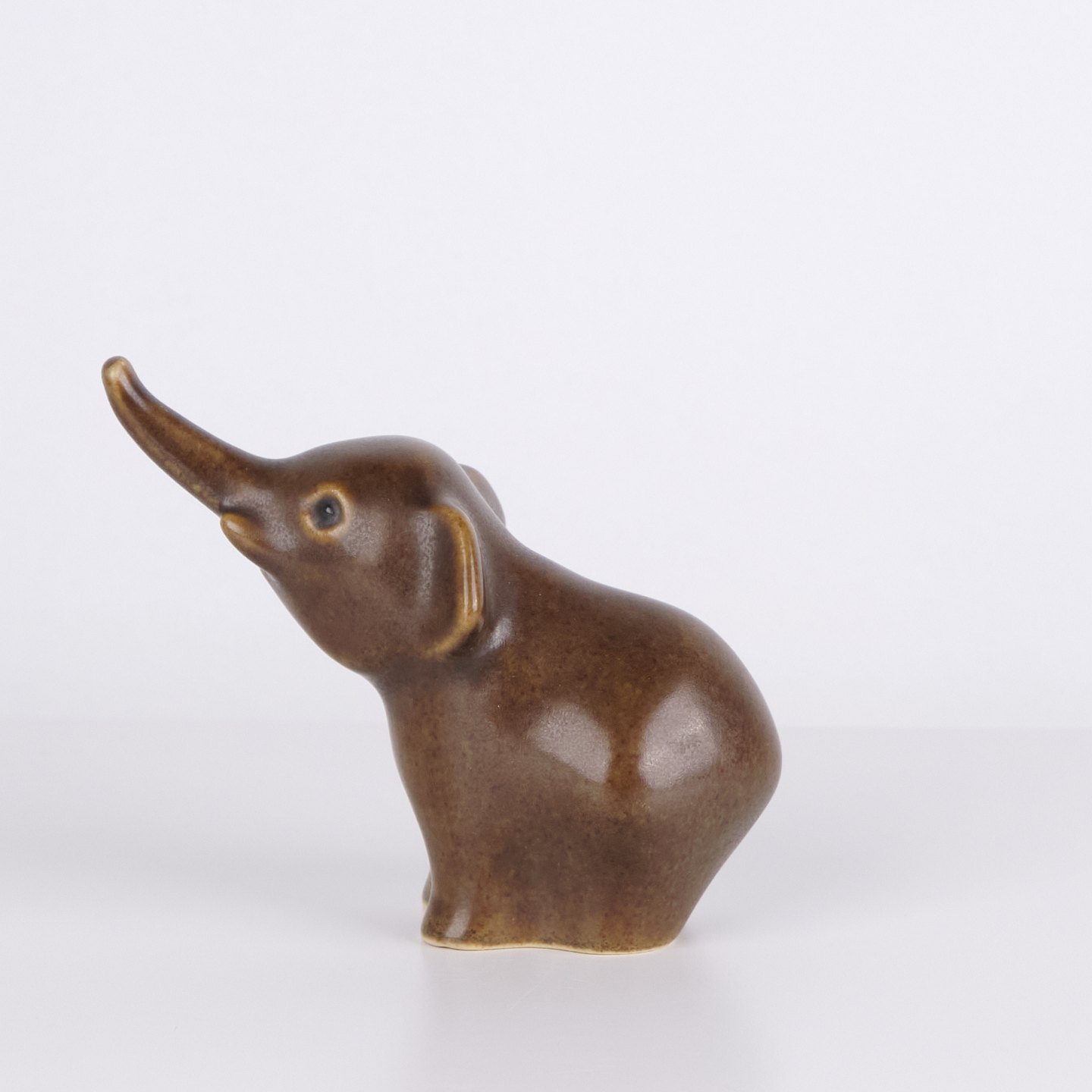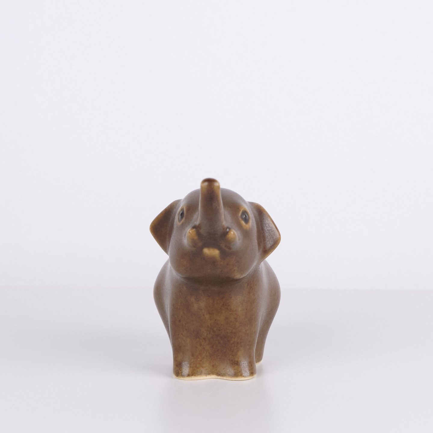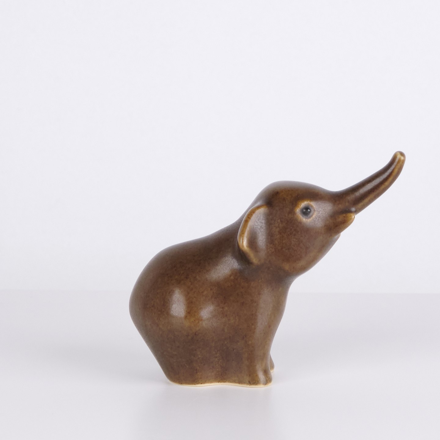 Description: Elephant figure by Knud Basse made in brown glazed ceramic. The figure is modeled with raised trunk and rounded forms, creating a lively and decorative expression. A classic example of Danish animal ceramics, where simple lines and characterful motifs are central. Sought-after figure among collectors of Knud Basse and Danish ceramics.
