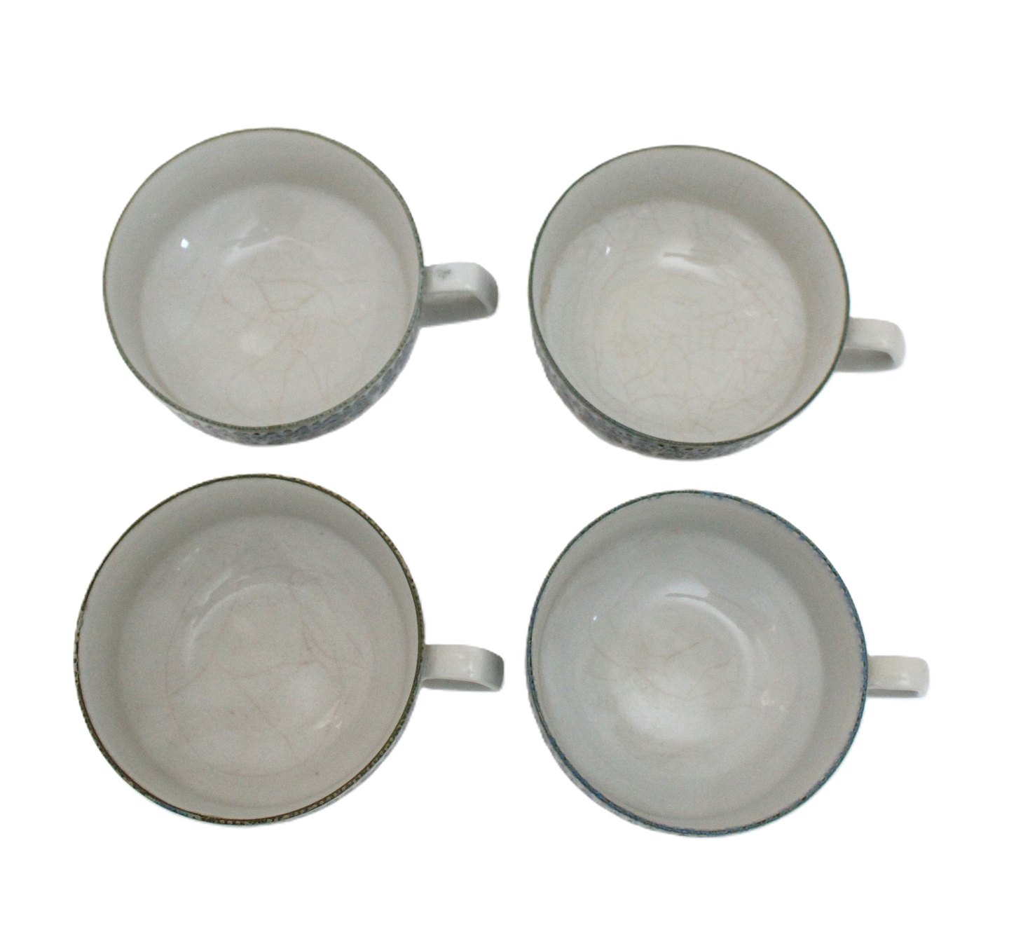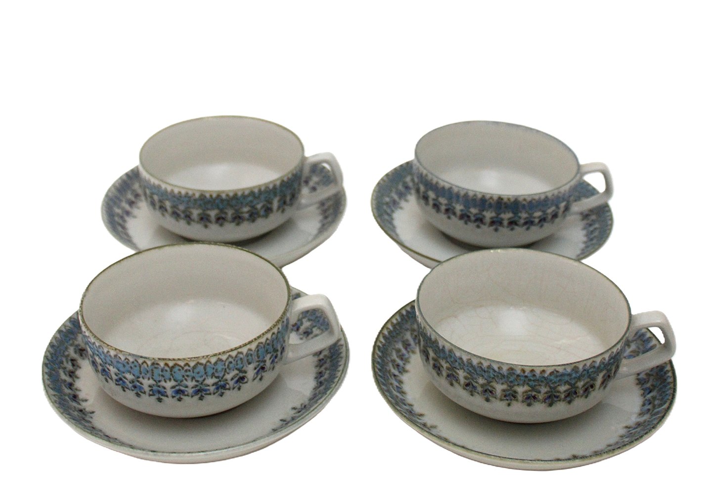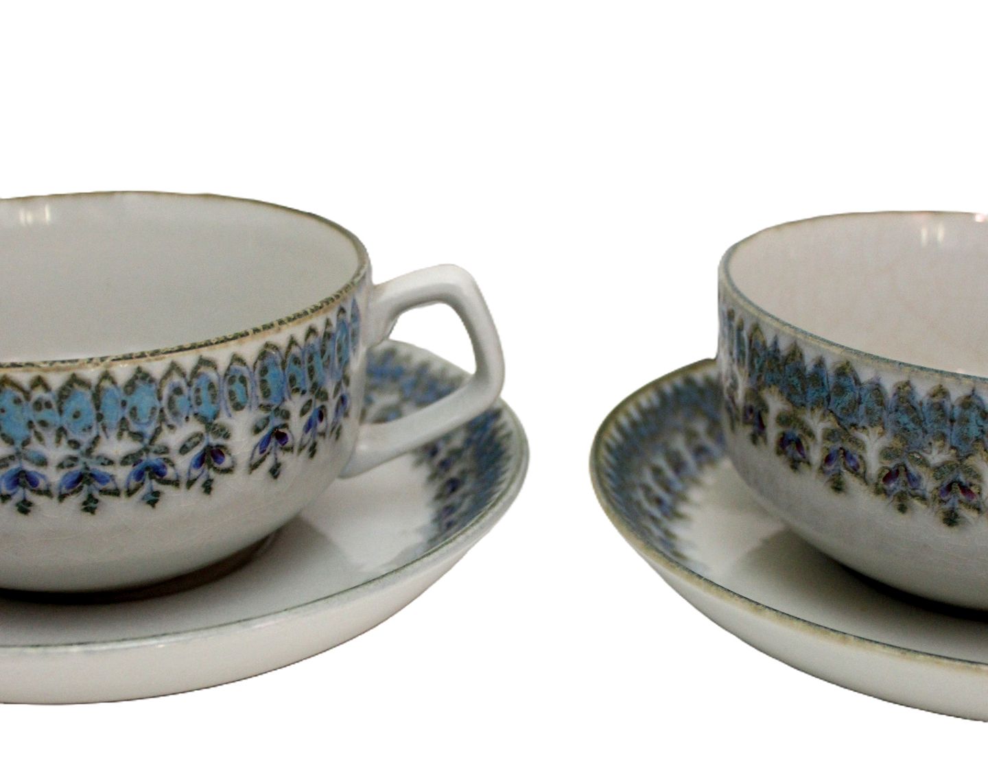 Beskrivelse: Aluminia, Berte, Tekop med underkop. Designet af Berte Jessen. Produceret i perioden 1962-66. OBS: Krakeleringer på alle dele, kop, underkop og kagetallerken. Ingen skår.