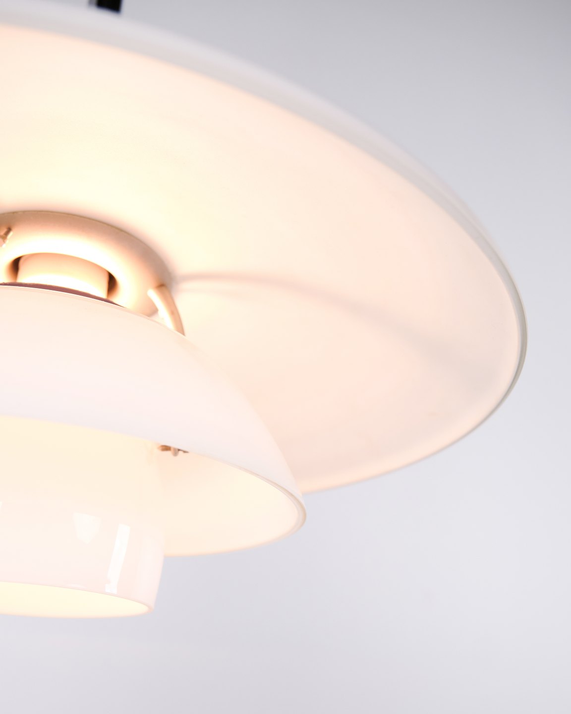 Beskrivelse: PH 4½-4 pendel designet af Poul Henningsen for Louis Poulsen. Lampen er udført med mundblæste treskærme i hvidt opalglas og kromophæng. Modellen har en overskærm på ca. 45 cm og anvender de nedre skærme fra PH 4/4-serien, udviklet for at give bredere lysfordeling ved lav ophængning over spisebord eller bordflade. Den nuværende version blev introduceret i 1980 og er en del af PH-seriens ikoniske blændfrie belysningssystem.