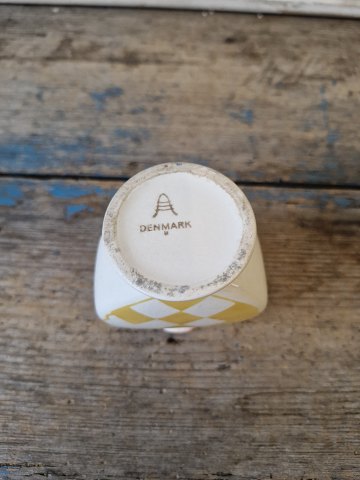 Aluminia gult julehjerte 1. sortering Højde 7,5 cm. Fremstår med små krakeleringer samt en reparation på kanten - se billed