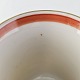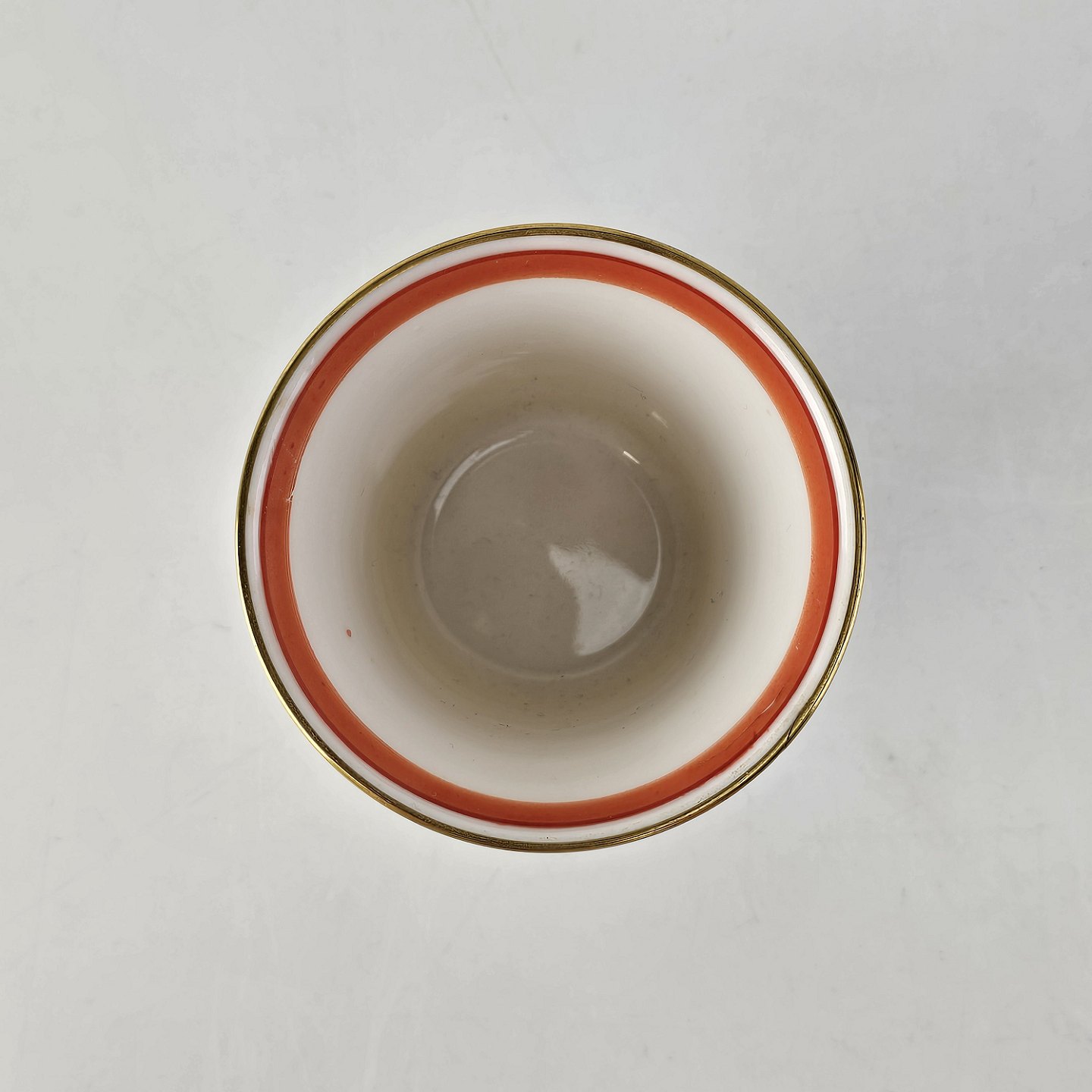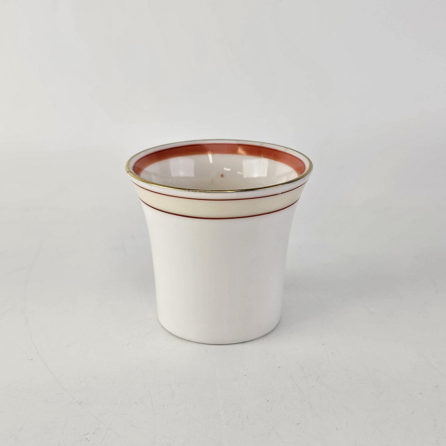Service i glat hvidt porcelæn pyntet med dekoration i beige, brændt orange og gylden streg.