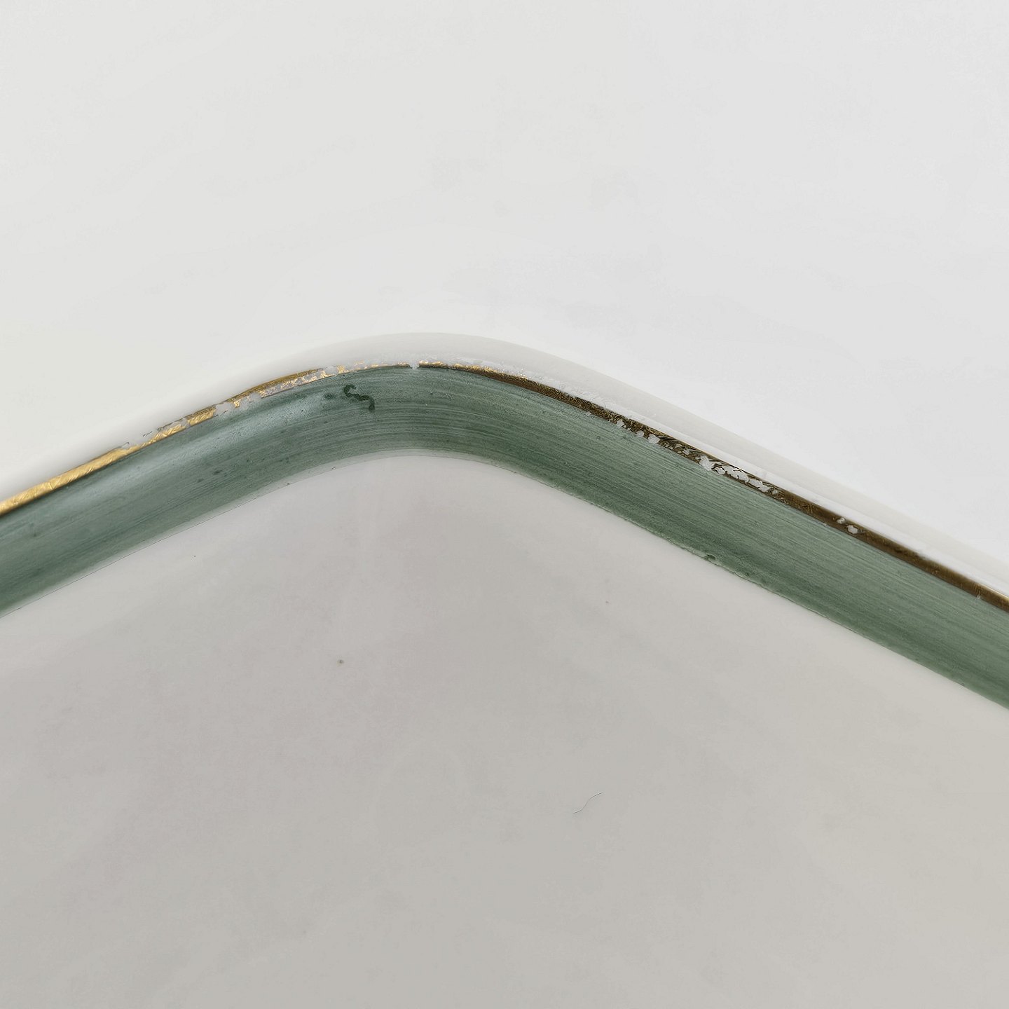 Stel i glat råhvidt porcelæn dekoreret med lysegrøn stribe og guldkant samt motiv af hjertegræs.