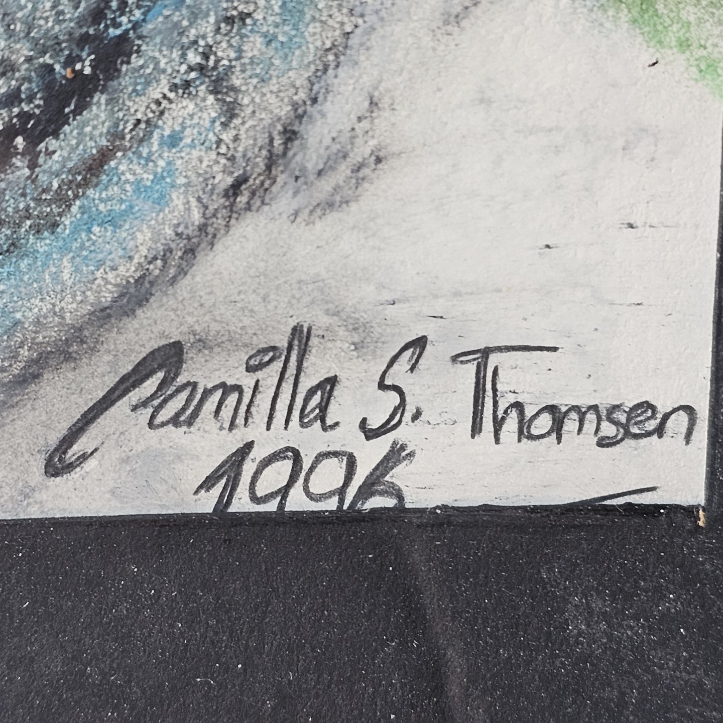 Oliekridt maleri på papir med motiv af en lyshåret og en mørkhåret kvinde. Monteret i metalramme, dateret 1996