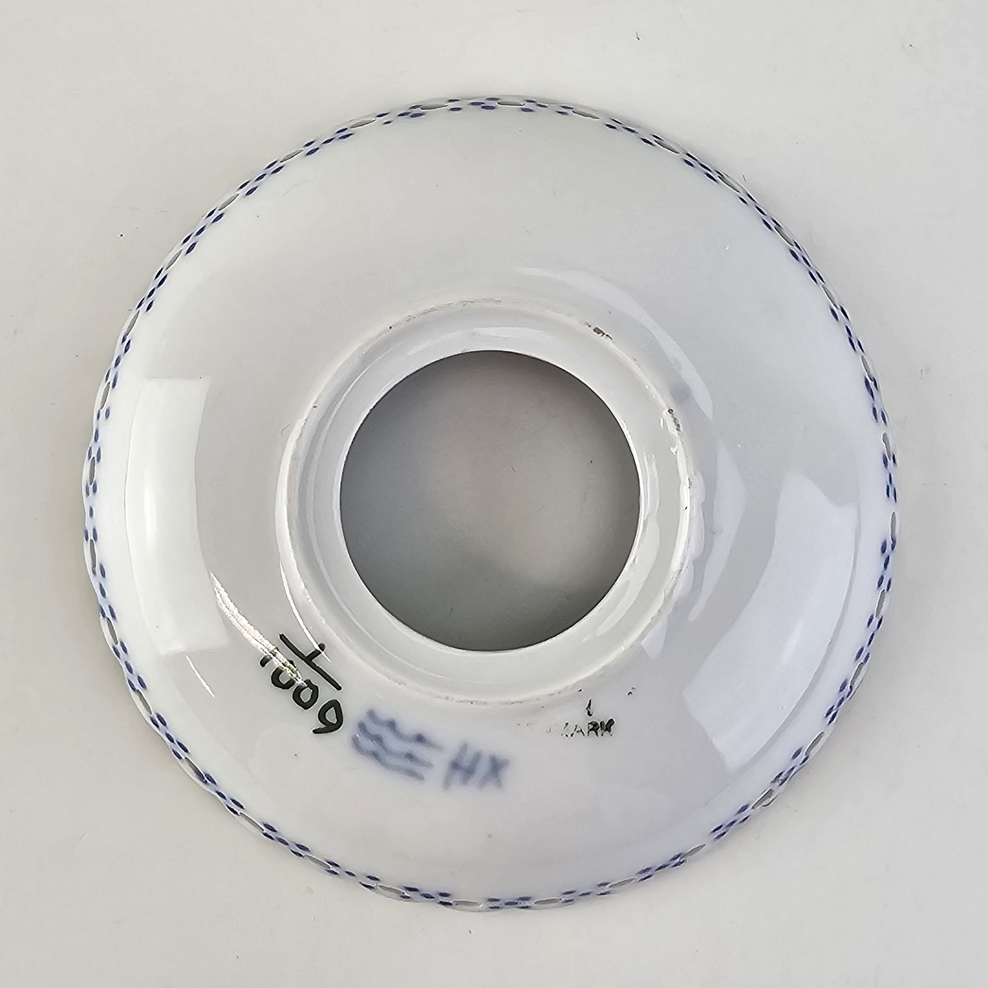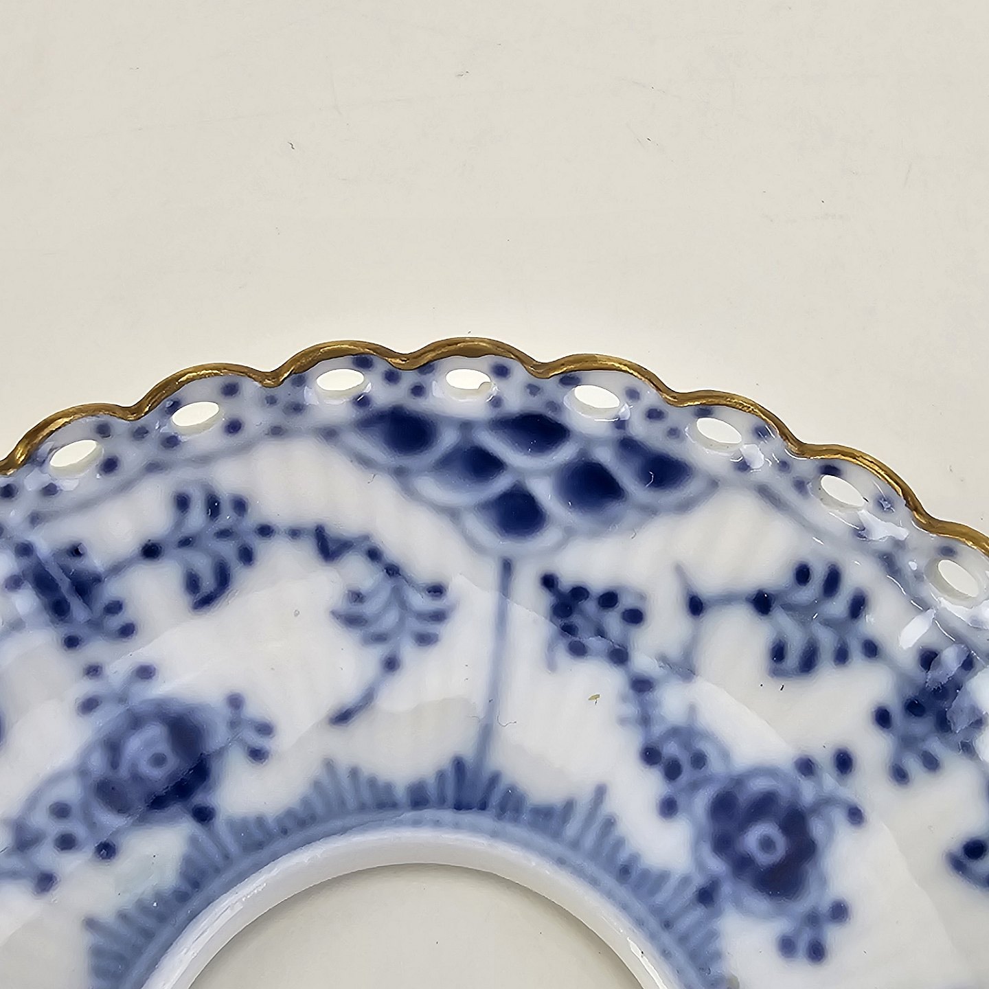 Musselmalet helblonde er riflet hvidt porcelæn med dekoration af blå ranker og en kant med blonder.