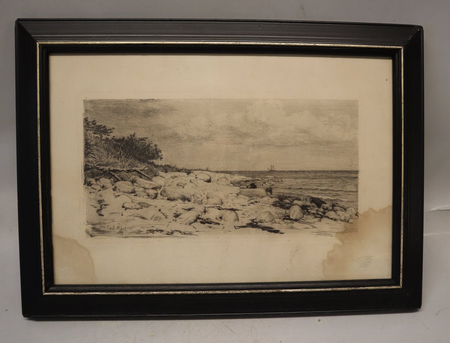 Beskrivelse: Carl Bloch Radering af kystlandskab 1889 29 x 40 cm iinklusiv gl. sort træramme - mindre skader i papiret