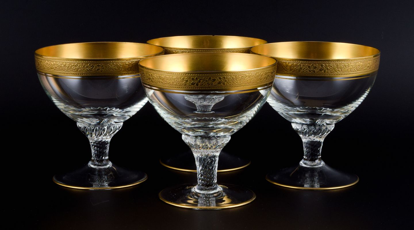 Rimpler Kristall, Zwiesel, Germany, four mouth-blown crystal champagne glasses with gold rim decorated with grapes and vine leaves. 1960s. In perfect condition. Dimensions: H 10.5 x 10.0 cm.