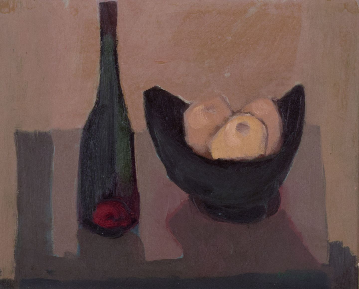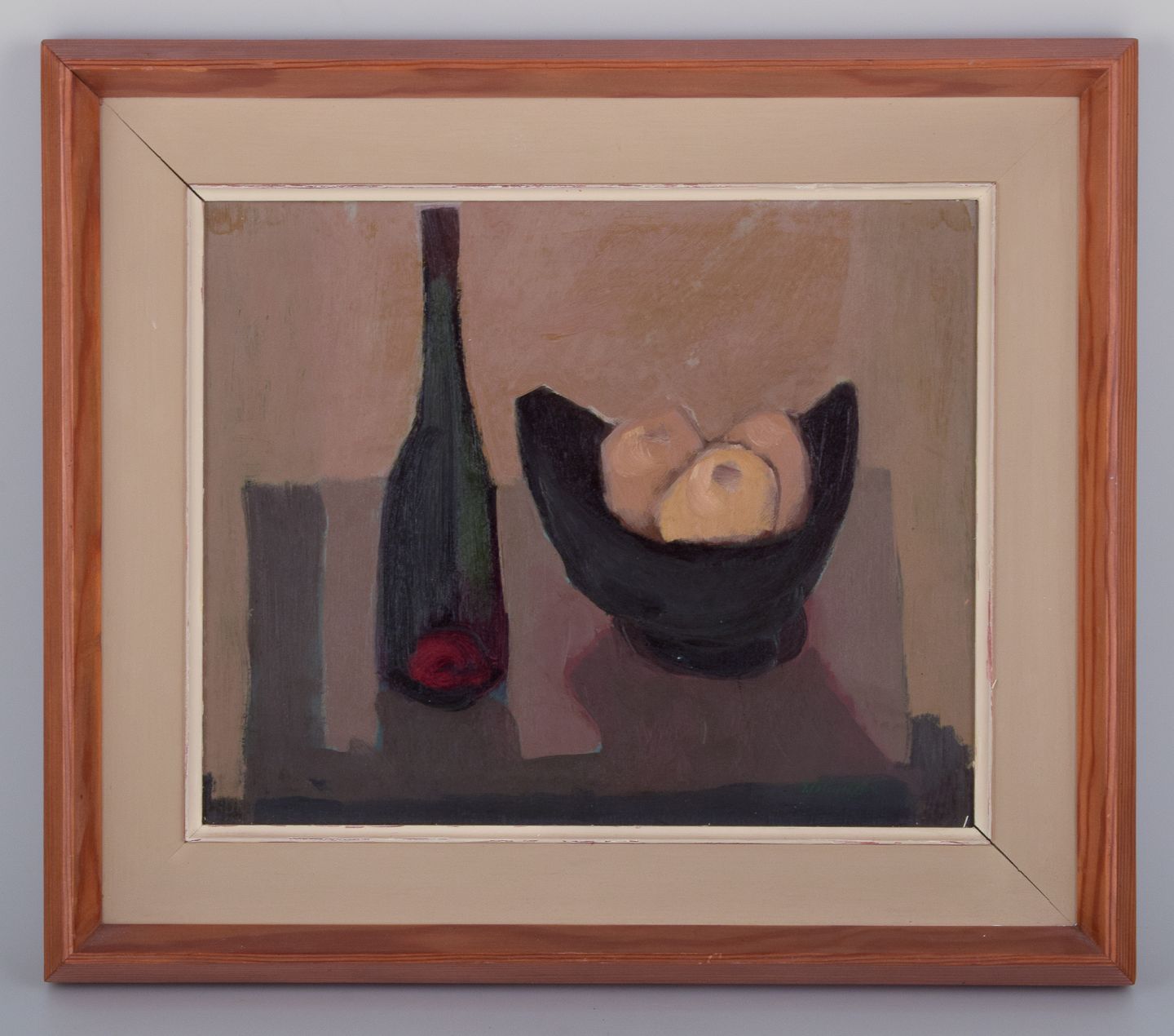Sven Johansson (1916-1990), Swedish artist, oil on board. Modernist still life with bottle and fruit basket.
