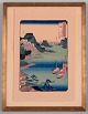 Japanese woodblock print on Japanese paper. Landscape with sailboats on the water.