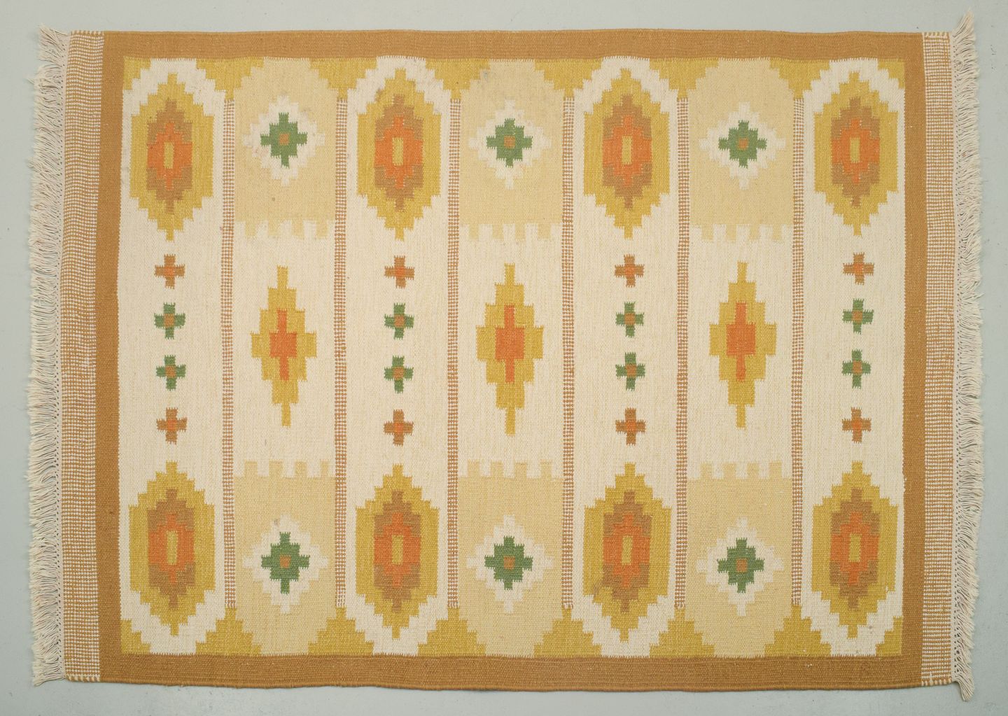 Swedish handwoven carpet in pure wool. Rölakan technique. Ochre yellow, orange, green, and white colors in a geometric pattern.Mid-20th century.