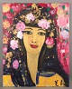 Yrsa Isabel Lind, Danish artist. Acrylic on canvas. Young woman with flowers in her hair. Gold leaf in hair. Signed with monogram. Late 20th century. Dimensions: H 100 cm x W 80 cm.