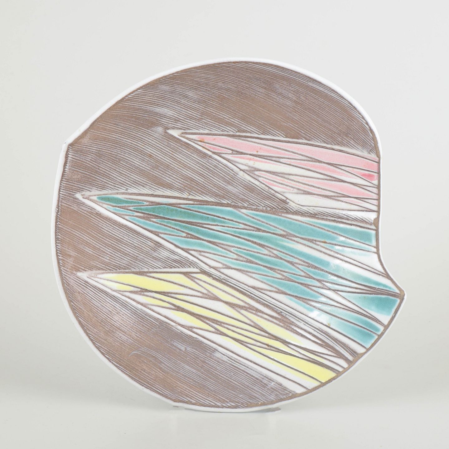Decorative round bowl with a softly organic form and incised surface, hand-painted in geometric segments of pastel yellow, pink, and turquoise on a brown background. A fine example of Mari Simmulson’s modernist style, combining colour, texture, and form in perfect balance.