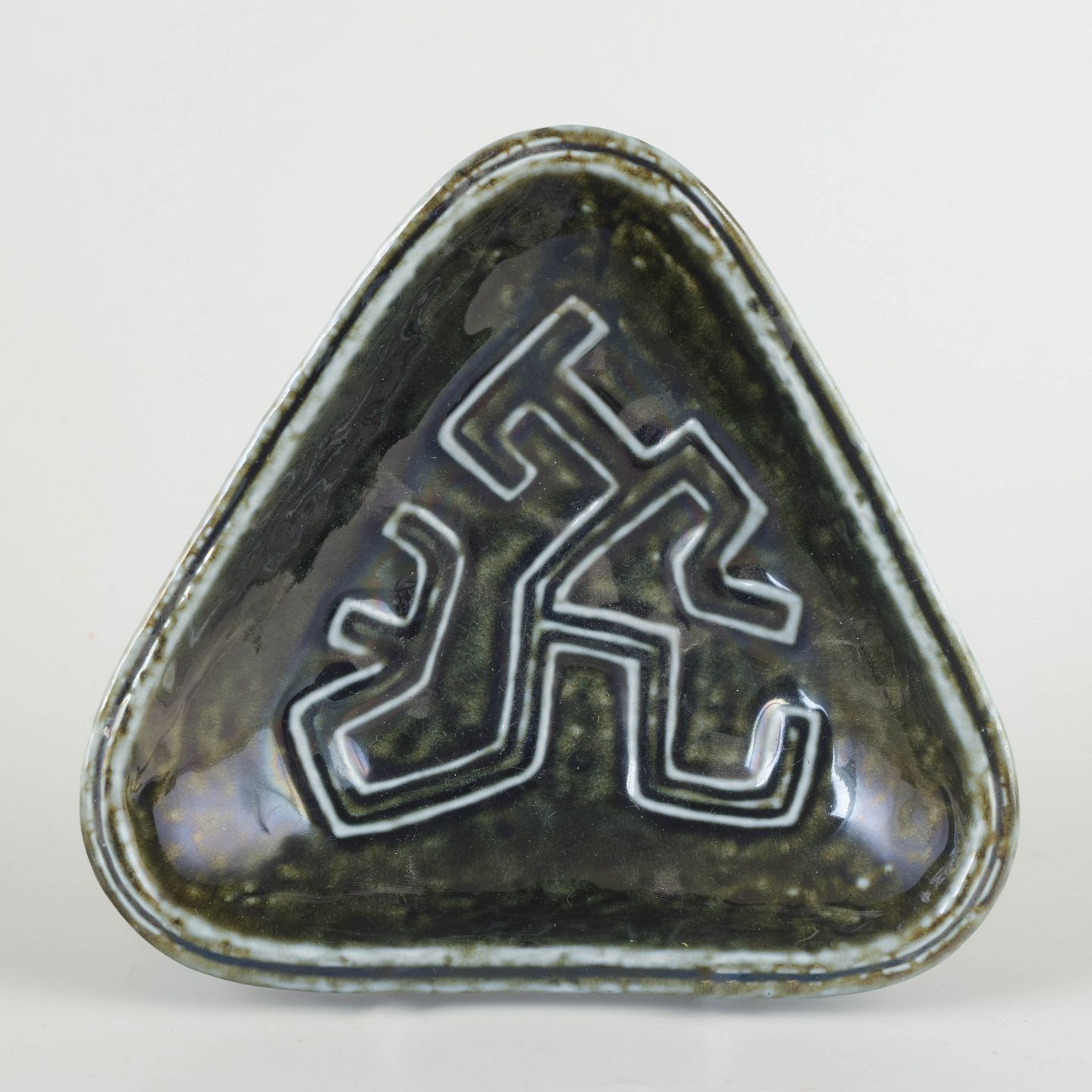 Rare triangular stoneware bowl from the Farina series, designed by Gunnar Nylund. The bowl features a central relief motif and a deep olive-green glaze with beautiful tonal variations — characteristic of Nylund’s elegant and experimental design language at Rörstrand during the 1960s.