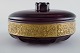 MOSER KARLSBAD lågkrukke i lilla mundblæst kunstglas. Messingbort med scenerier. 1930/40'erne. Måler: 15 x 8,5 cm. I flot stand.