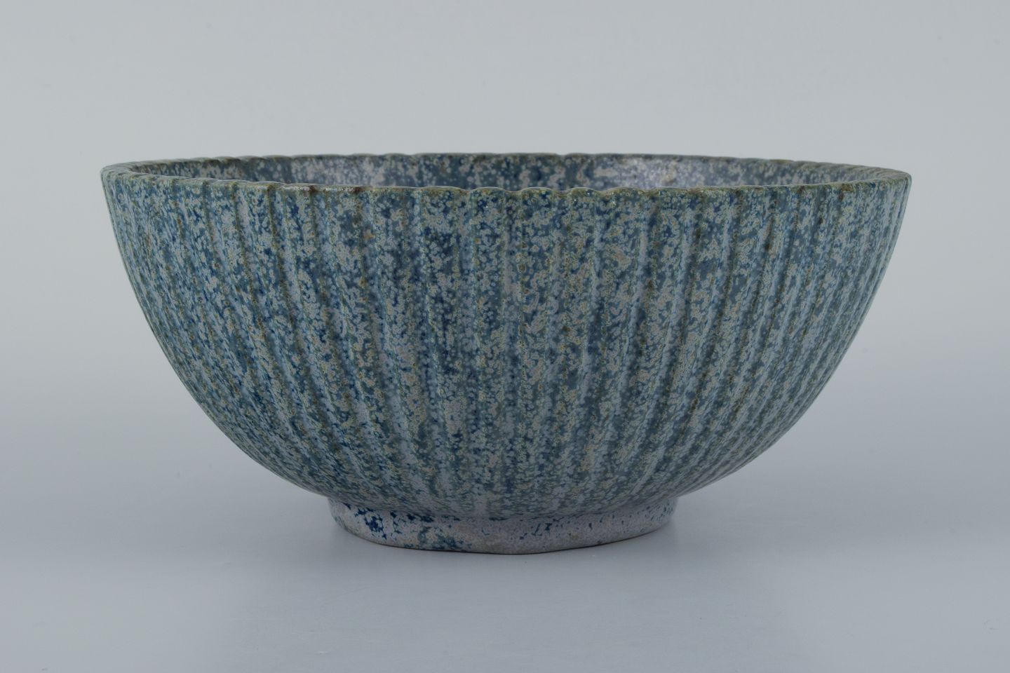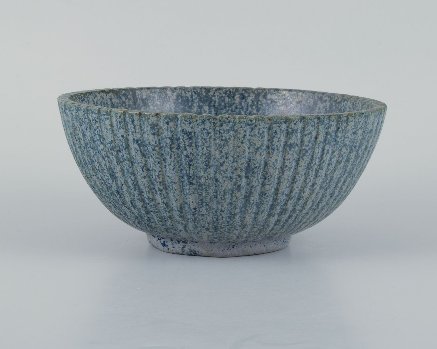 Arne Bang, ceramic bowl in grooved design, glaze in shades of blue