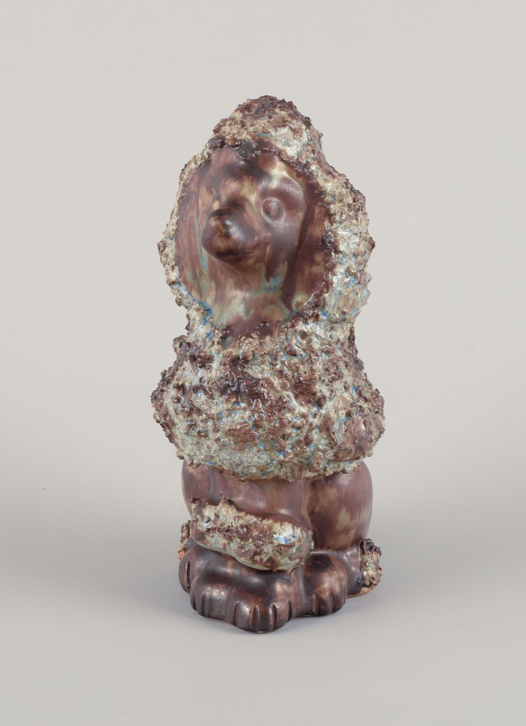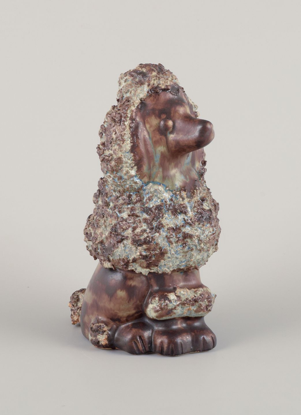 EGO Lidköping, Stengods, Sverige. Keramikfigur af kongepuddel. Glasur i brungrønne toner. 1970/80’erne. Stemplet. Perfekt stand. Mål: L 11,0 cm. x B 8,0 cm. x H 18,0 cm.