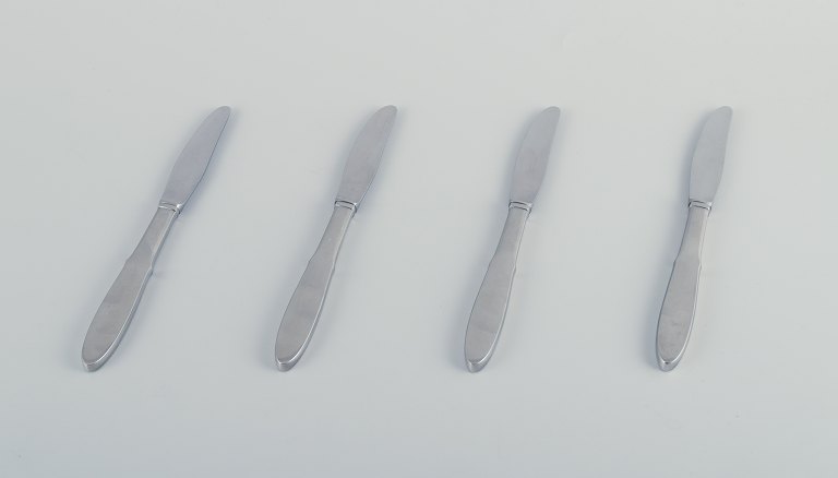 Gundorph Albertus for Georg Jensen. Et sæt på fire langskaftede Mitra frokostknive i rustfrit stål. Georg Jensen knivblad. Ca. 1960. I flot stand. Stemplet. Mål: L 20,0 cm.