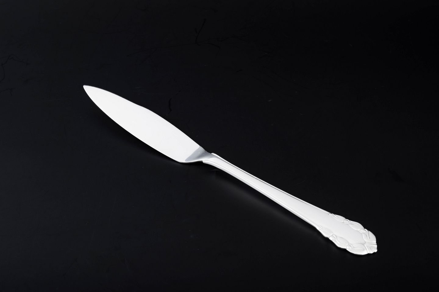 Fish knife in the “Lily of the Valley” pattern. Mirror-polished sterling silver, with an elegant handle termination featuring a discreet flower and leaf motif.