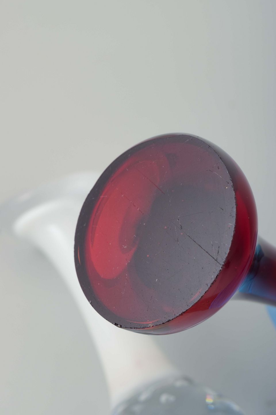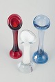 A set of sculptural glass vases from Mantorp Glasbruk and Skånska Glasbruket, Sweden, produced circa 1969. The vases are characterized by their heavy base, slender neck, and organic drop-shaped opening. Classic examples of Scandinavian glass art from the period.