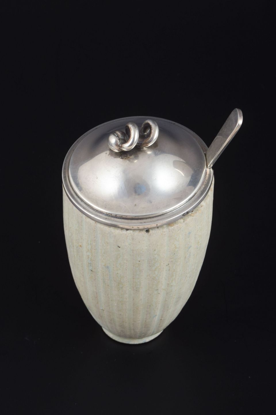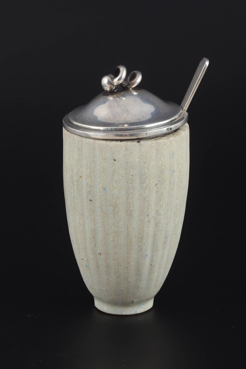 Cylindrical ribbed stoneware jar in greyish glaze, with matching silver lid stamped C. Holm 830S, and spoon in sterling silver stamped Hans Hansen, Denmark Sterling.