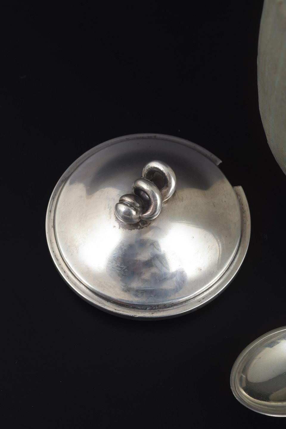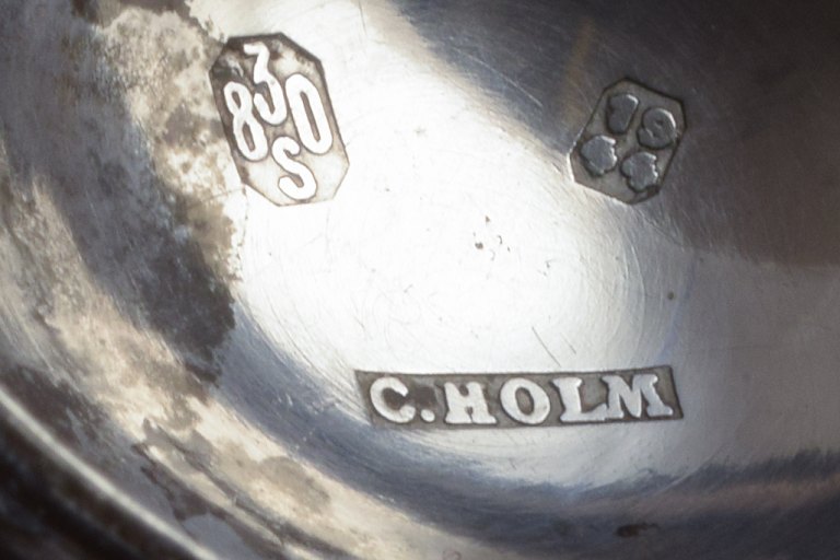 Marks: “C. HOLM 830S” on lid, “Hans Hansen Denmark Sterling” on spoon.