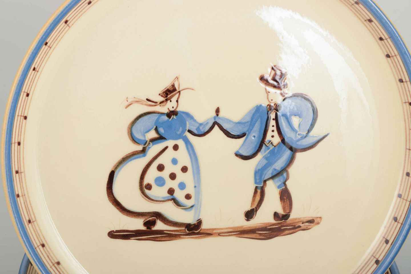 Thrown and hand-decorated faience with motifs of folk dancing couples and musicians in blue, brown, and black tones on a cream-coloured ground. Decorated with blue and brown rim lines.